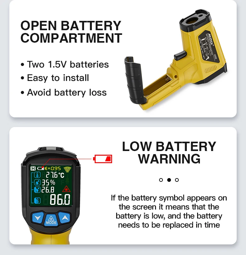 Цветной экран с полным обзором. 0,5 второй быстрый измерением температуры. Излучение регулируется, Сигнализация высокой и низкой температуры, Хранение данных, Преобразование единиц, Многоточечное измерение, Подсказка низкой мощности, Автоматическое выключение, Яркий цветной экран, Температурный зонд, Измерение скорости, Максимум