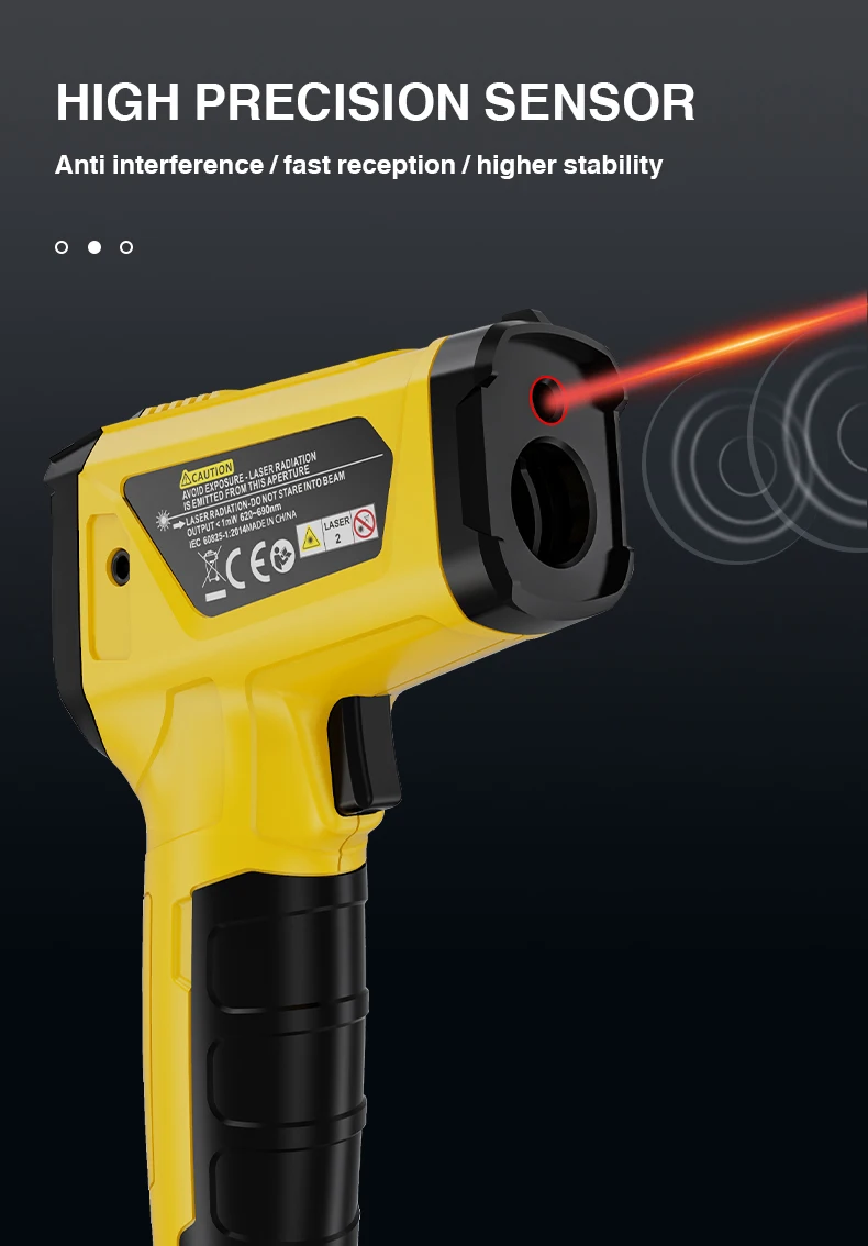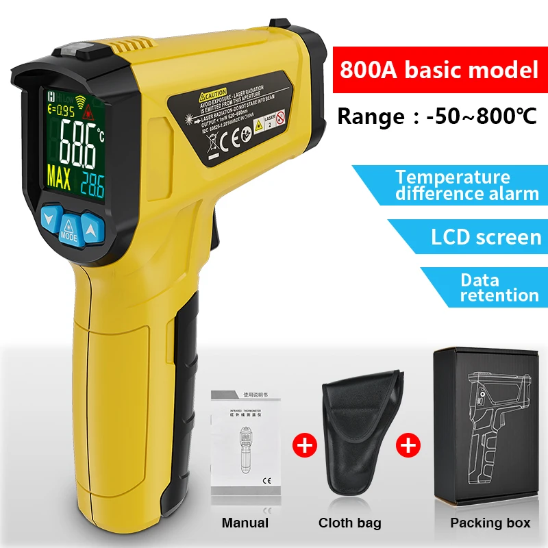 Примечание: батарея в комплект не входит Модель: 800A,800B,800C Диапазон измерения температуры: 800A:-50 ~ 800C 800B:-50 ~ 800C, с температурным зондом 800C:-50 ~ 800C, с температурным зондом, температура окружающей среды:-10 ~ 60C, влажность окружающей среды: 0% ~ 100% RH плесени и температуры точки росы D:S : 12:1 Излучение: 0,1 ~ 100 регулируемая Диапазон отклика: 8 ~ 14 мкм Лазерное позиционирование: 12 точечное кольцо, указывающее температуру чувствительной зоны Лазер:<1 мВт/630-670нм Уровень 2 Время отклика:<0.5s Автоматическое выключение: 30 секунд