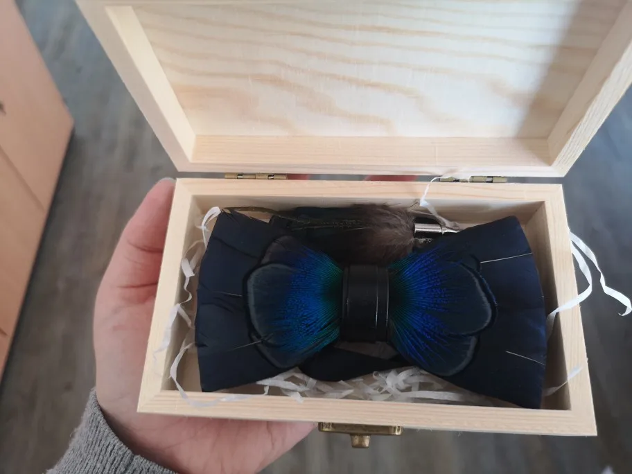 Особенности: Совершенно новый и смешной Материал: перо и кожаный галстук-бабочка Размер: 6.5x12см Набор 1: 1 галстук-бабочка + 1 брошь + деревянная коробка Комплект 2: 1 галстук-бабочка + 1 брошь + черная коробочка Комплект 3: 1 галстук-бабочка + черная коробка Легко подходит Вечерние Простой и модный дизайн
