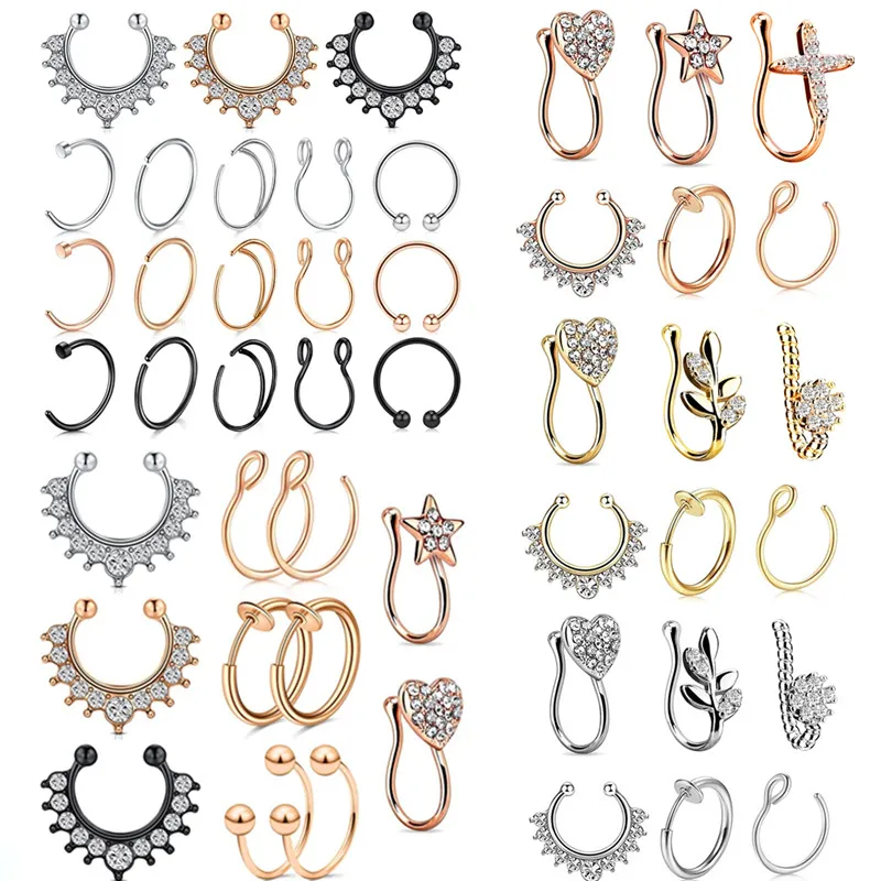 Набор имитационных колец для носа в виде цветка из нержавеющей стали, кристалл, не пирсинг, Кафф для ушей, серьги, Надеваемые На ушной хрящ клипса, имитация губ, пирсинг