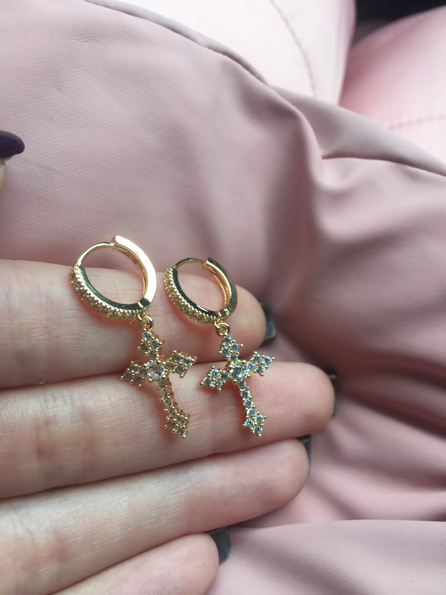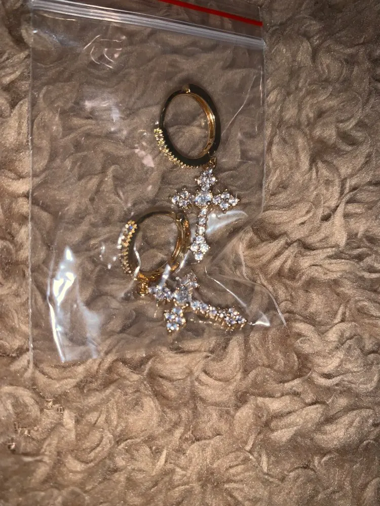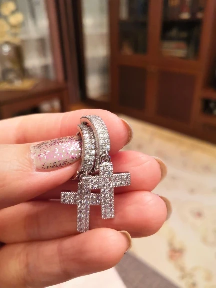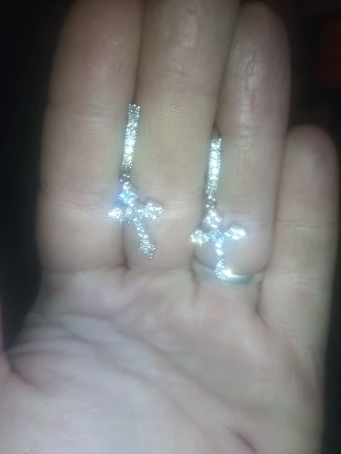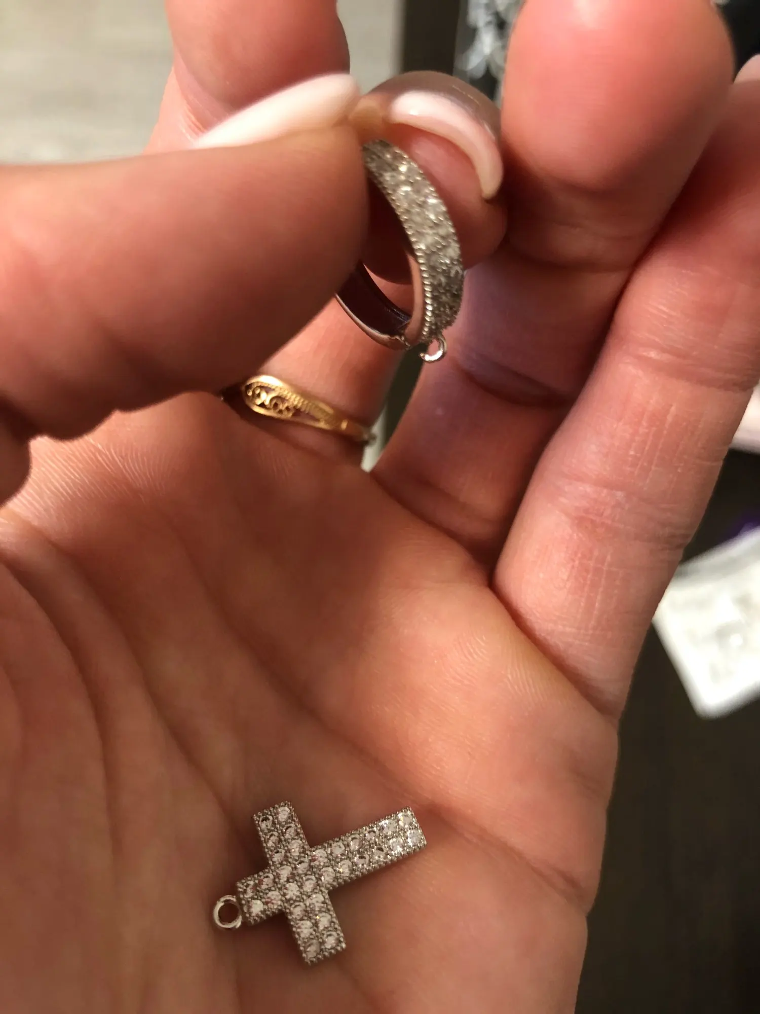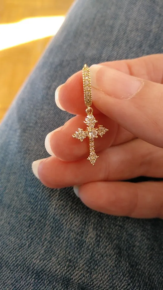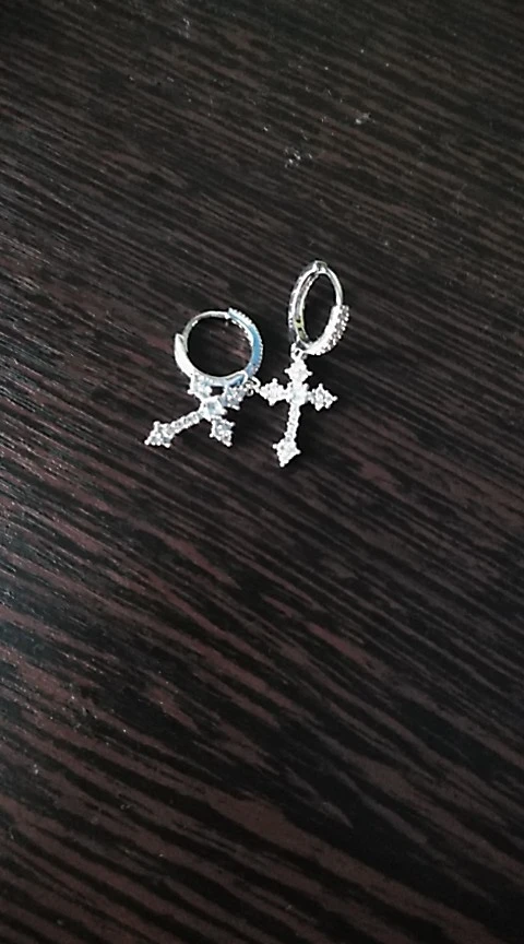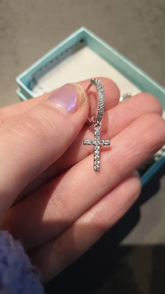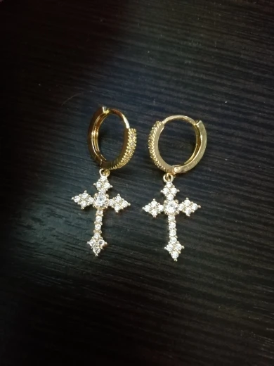 Выглядит красиво, камушки на месте, но вот одна сережка не застегивалась и крестик отвалился, пришлось подогнуть, теперь все норм.