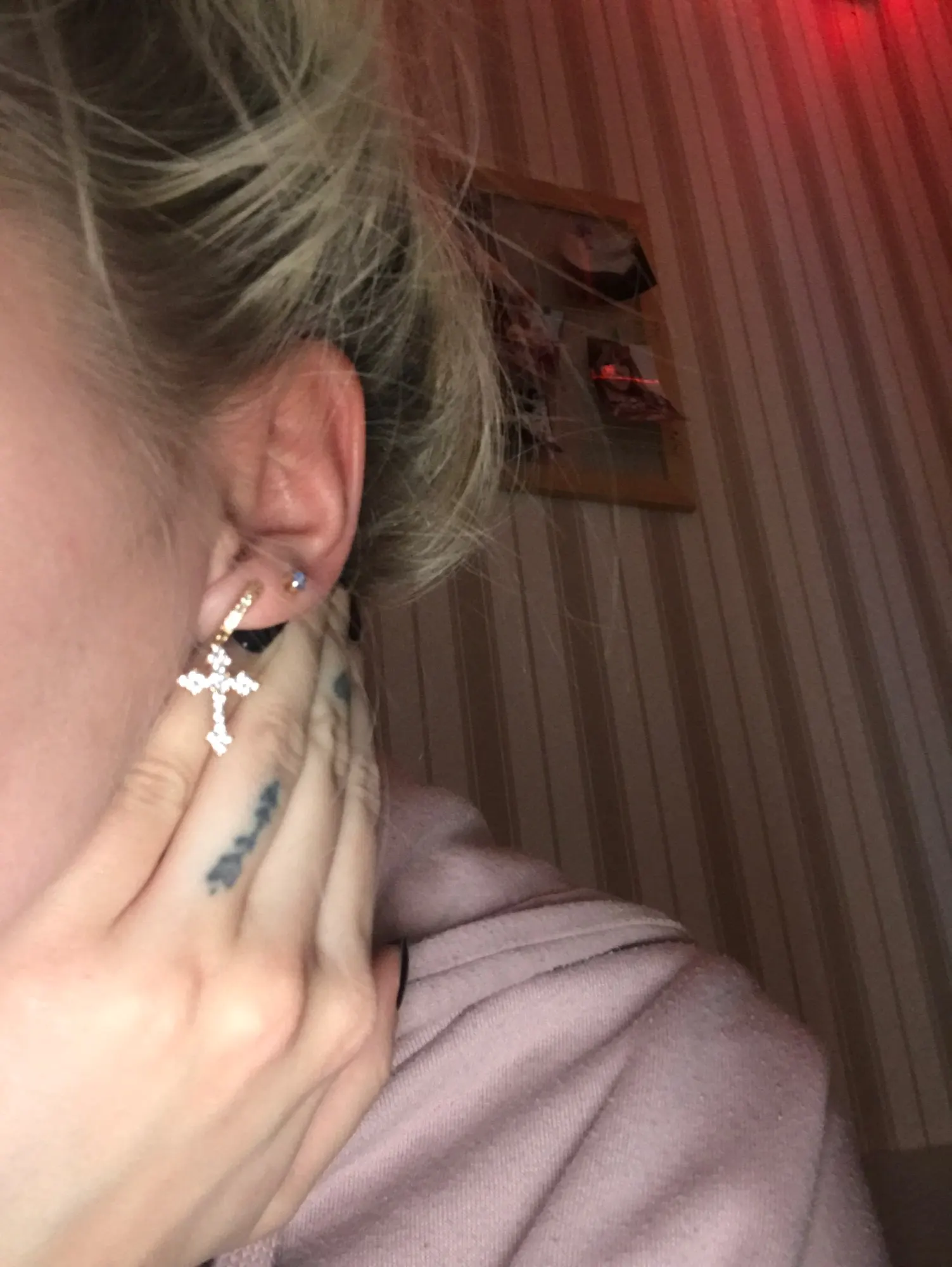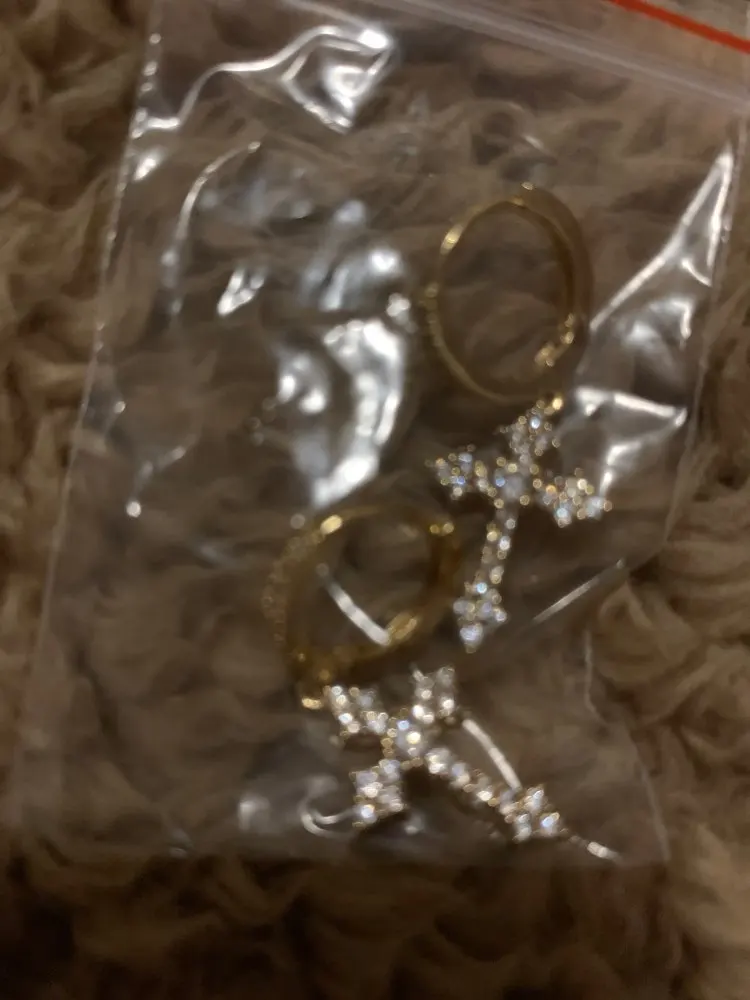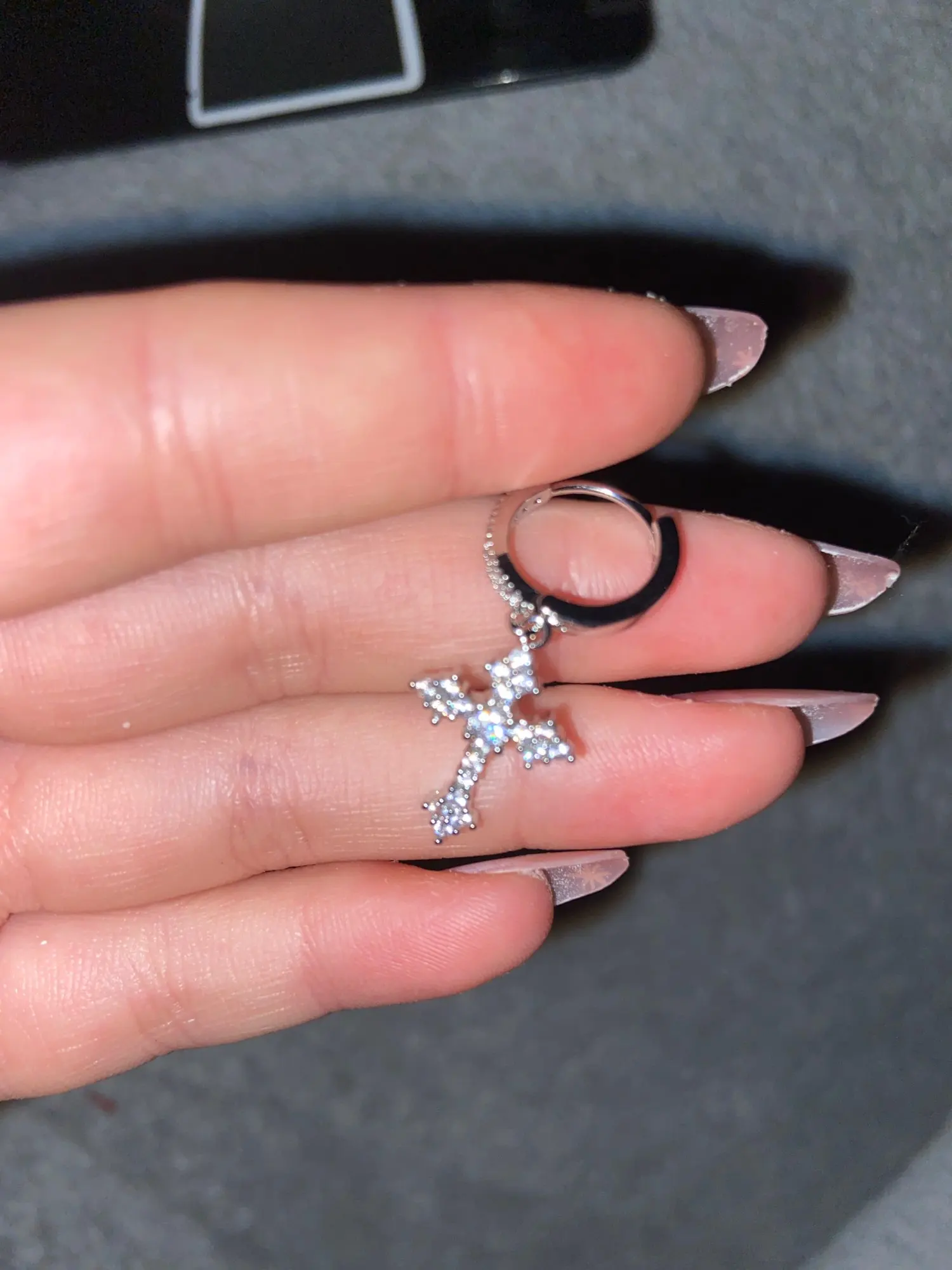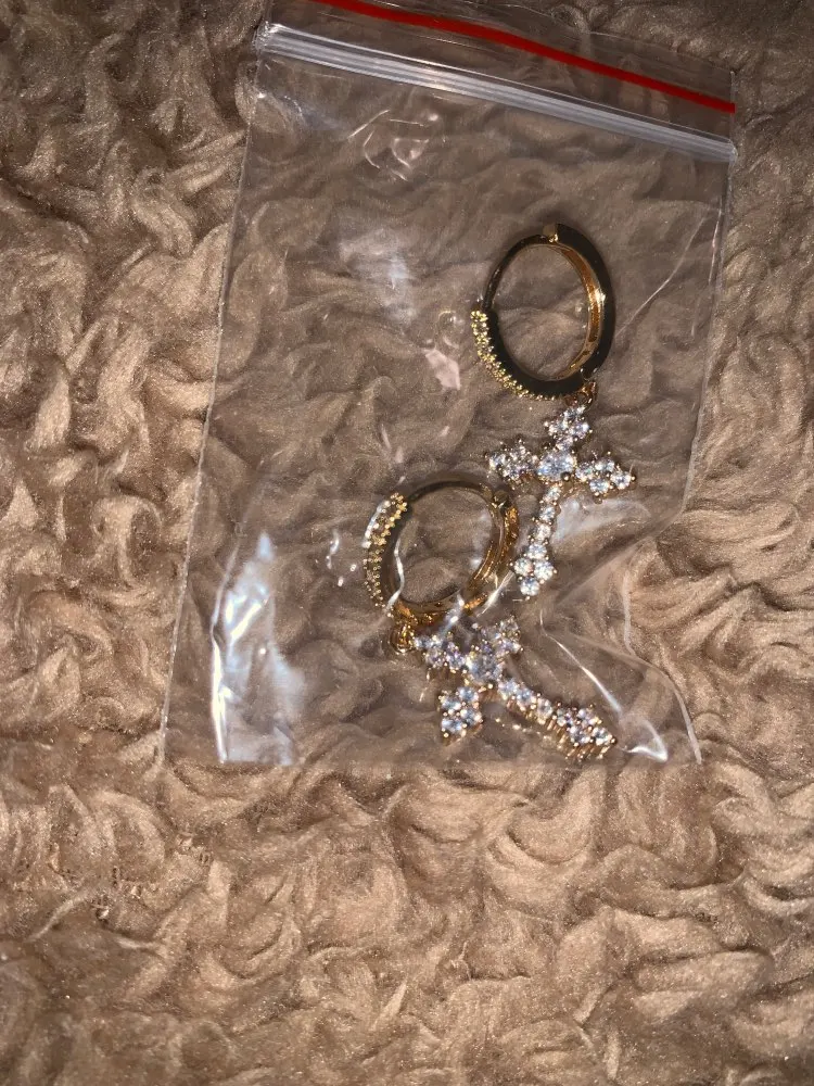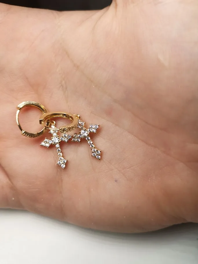 Выглядит красиво, камушки на месте, но вот одна сережка не застегивалась и крестик отвалился, пришлось подогнуть, теперь все норм.