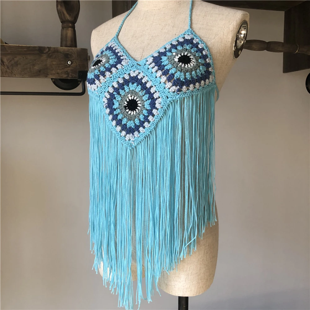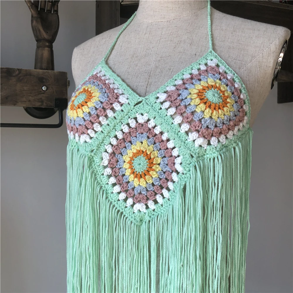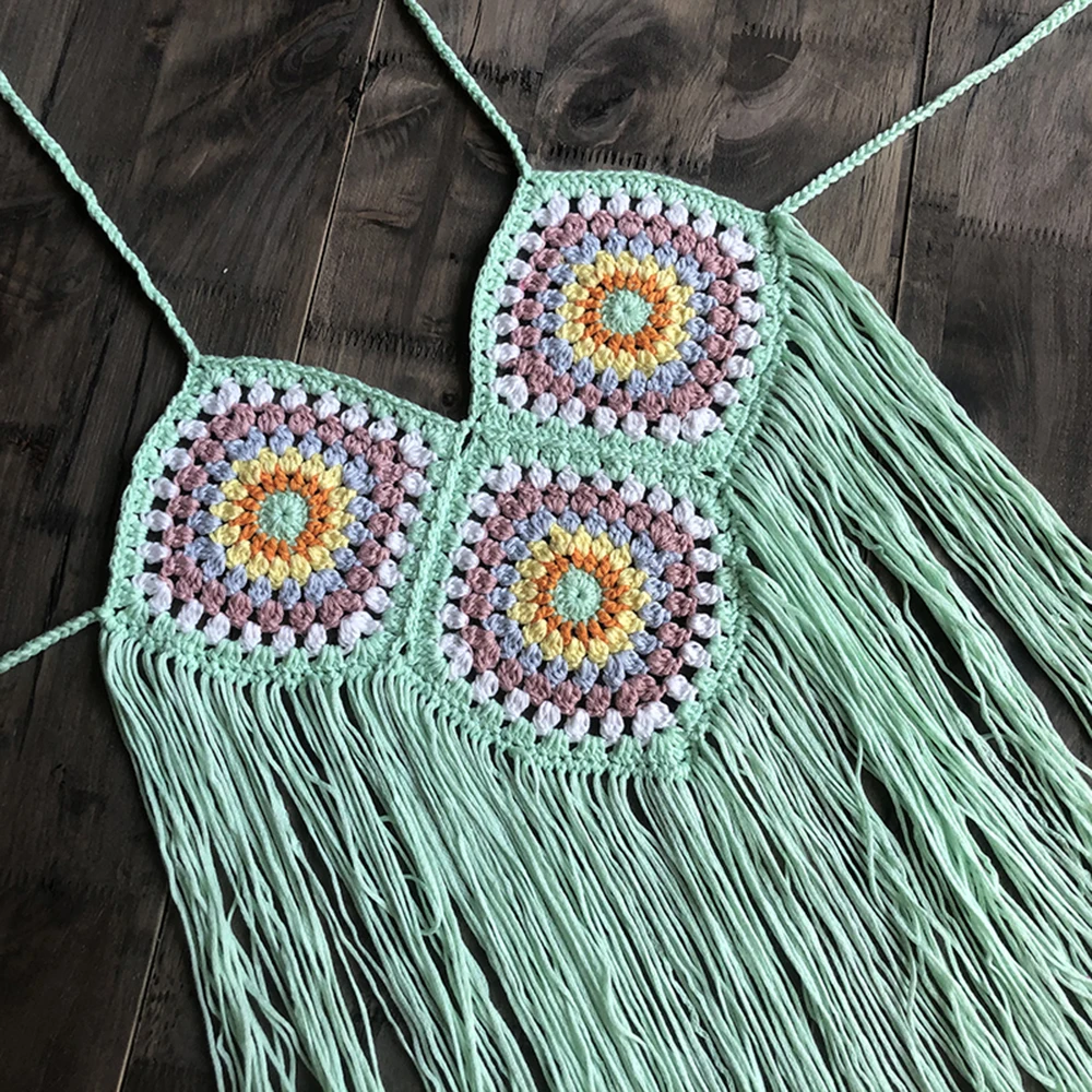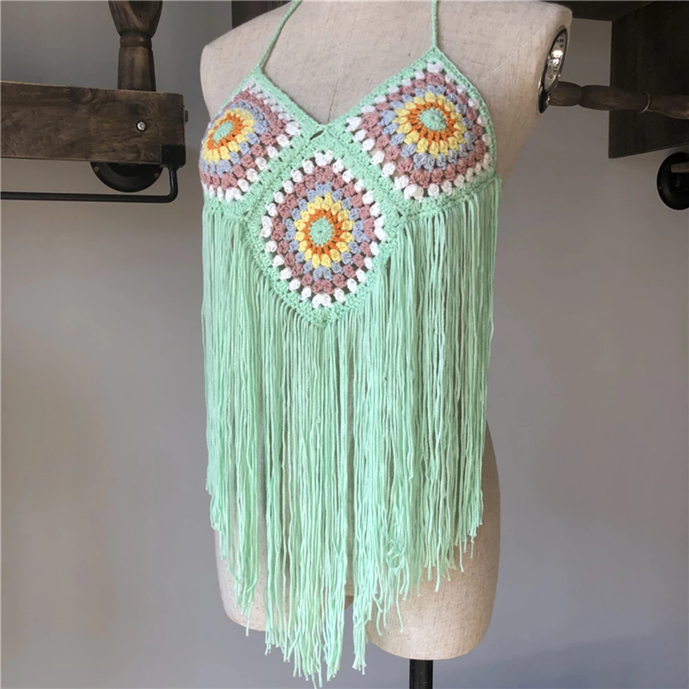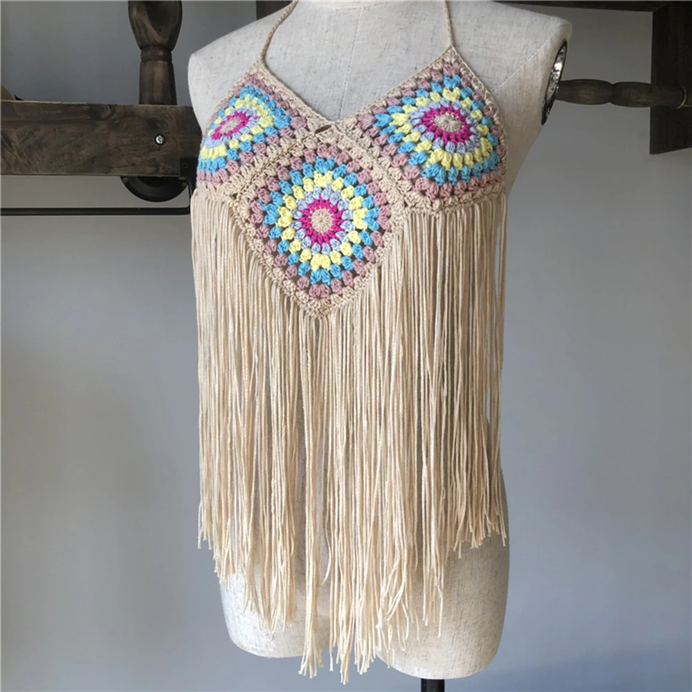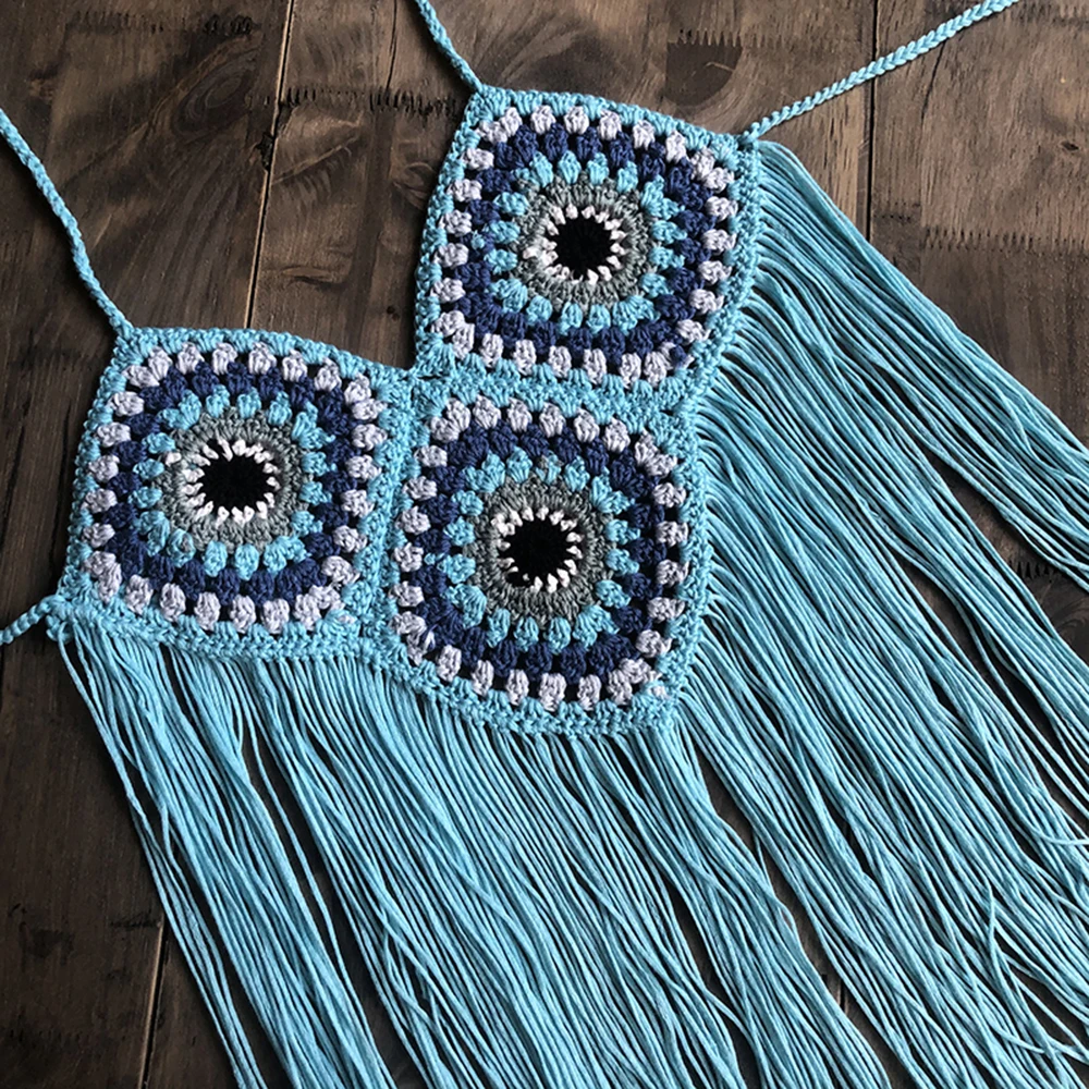 Женский вязаный крючком топ-бикини с кисточками, облегающий купальный топ, богемный купальник, пикантный вязаный крючком бикини ручной работы, хлопковый топ