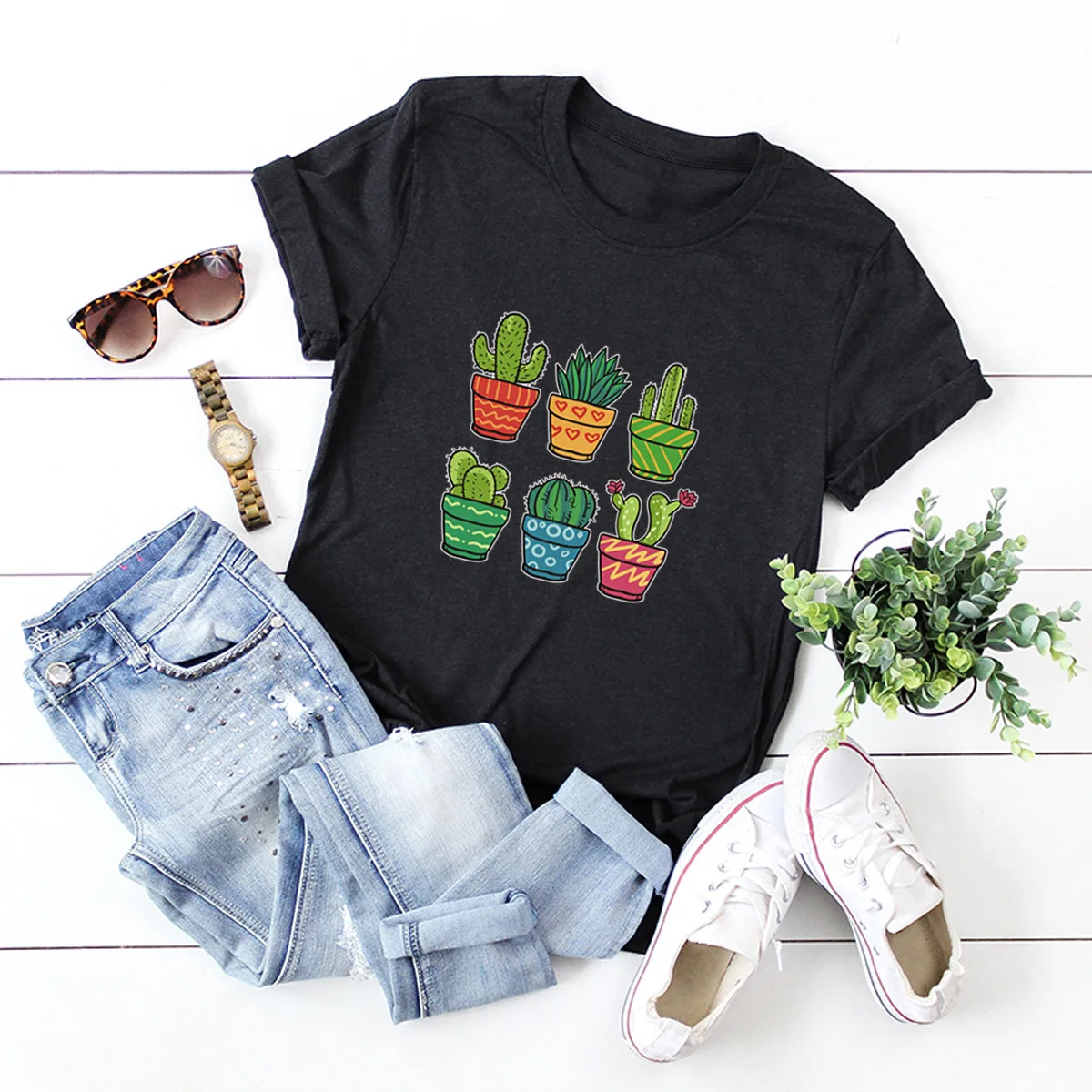 Футболка женская с принтом кактуса, Повседневная рубашка оверсайз из 100% хлопка, топ с коротким рукавом, на лето