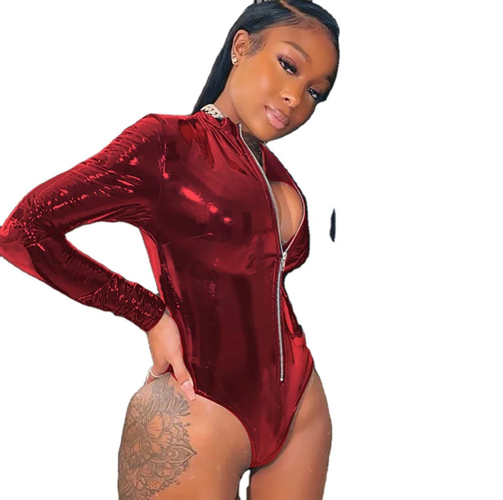 Однотонный Блестящий Комбинезон на молнии, с длинным рукавом, эластичное боди