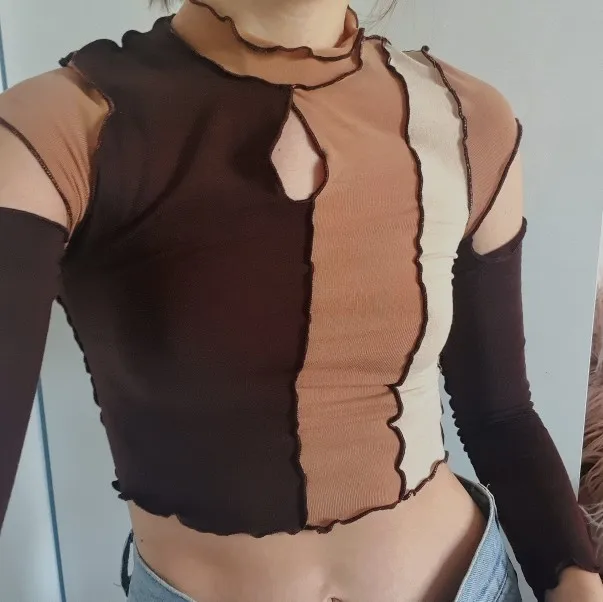 Укороченный топ с вырезами и оборками для женщин, пуловеры Y2K, короткая футболка с контрастным длинным рукавом, Клубная одежда в стиле Харадзюку, осенний Топ