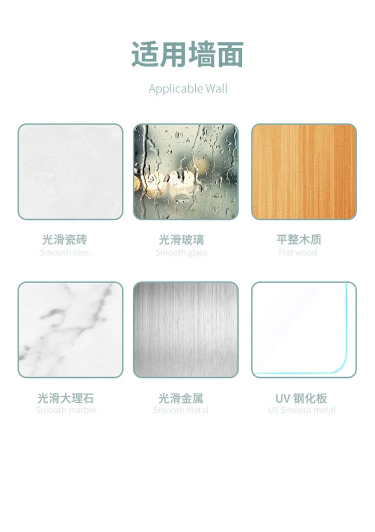 Применимая поверхность стен: гладкая керамическая плитка, гладкий мрамор, гладкая нержавеющая сталь, гладкая поверхность под дерево, гладкое стекло Не применимо к поверхности стен: Удалите пыль с поверхности, шероховатую поверхность, неровную поверхность