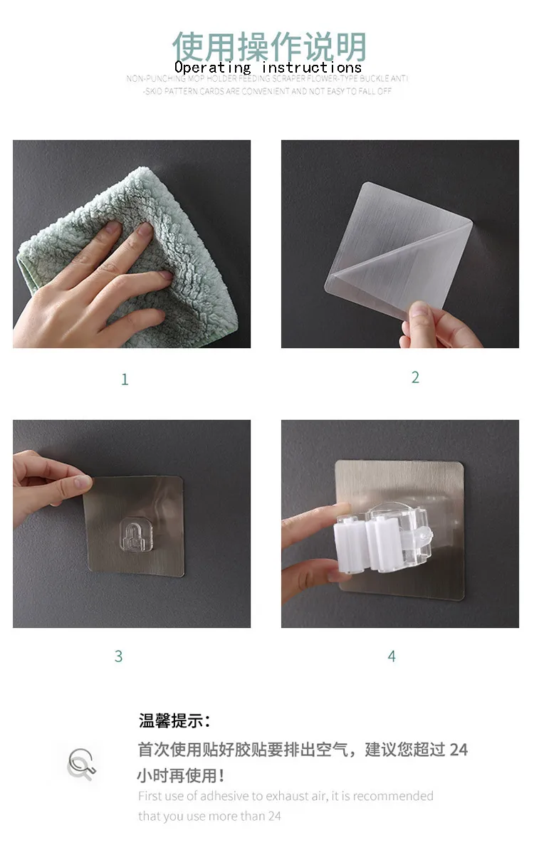 1. Протрите стену или стекло чисто 2. Снимите защитную пленку на поверхности 3. Вставьте в стену и Удалите лишние пузырьки 4. Установите держатель для швабры и используйте его в течение 24 часов