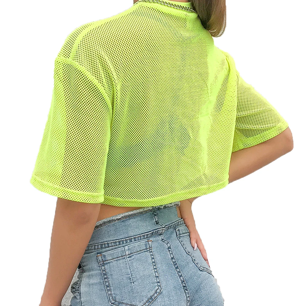 Женские ярко-зеленые Ажурные топы, летние сетчатые Прозрачные топы, укороченные свободные футболки с короткими рукавами, Женская Клубная Мода