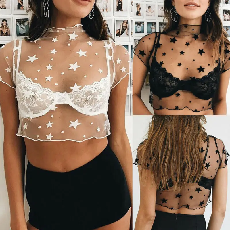 Летний Новый Модный женский сексуальный сетчатый укороченный топ со звездами, прозрачная рубашка с коротким вырезом, черные и белые топы, футболки