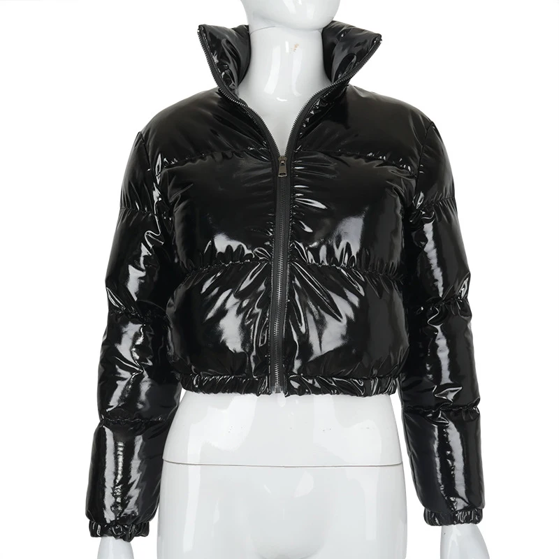 Зимнее пузырьковое пальто из лакированной кожи для женщин, большие размеры, на молнии, водонепроницаемая короткая женская куртка, теплая Женская парка из искусственной кожи с длинным рукавом