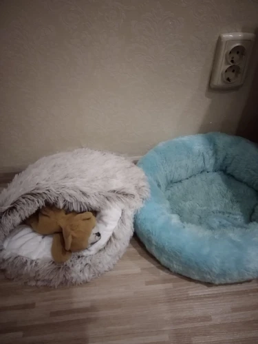 До Хбр за месяц, отслеживалось, т.к несколько товаров. Лежанка была в вакуумном пакете, ещё и свернутая. На фото в таком вот виде, крыша пока не стоит. Для сравнения голубая старая лежанка выглядит пушистее и объемнее. У новой более длинный ворс, но маленькое спальное место, игрушка внутри для сравнения. Собака в полтора раза больше игрушки. Взяла на безотопительный период, чтоб собака могла прятаться, но она туда даже не зашла. Привыкла к своей лежанке. Надеюсь, не зря купила.
