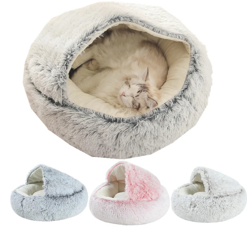 Стильная мягкая кровать для собак и кошек, круглые плюшевые, теплая кровать для кошек, длинная плюшевая кровать для маленьких собак и кошек, гнездо 2 в 1, кровать для кошек