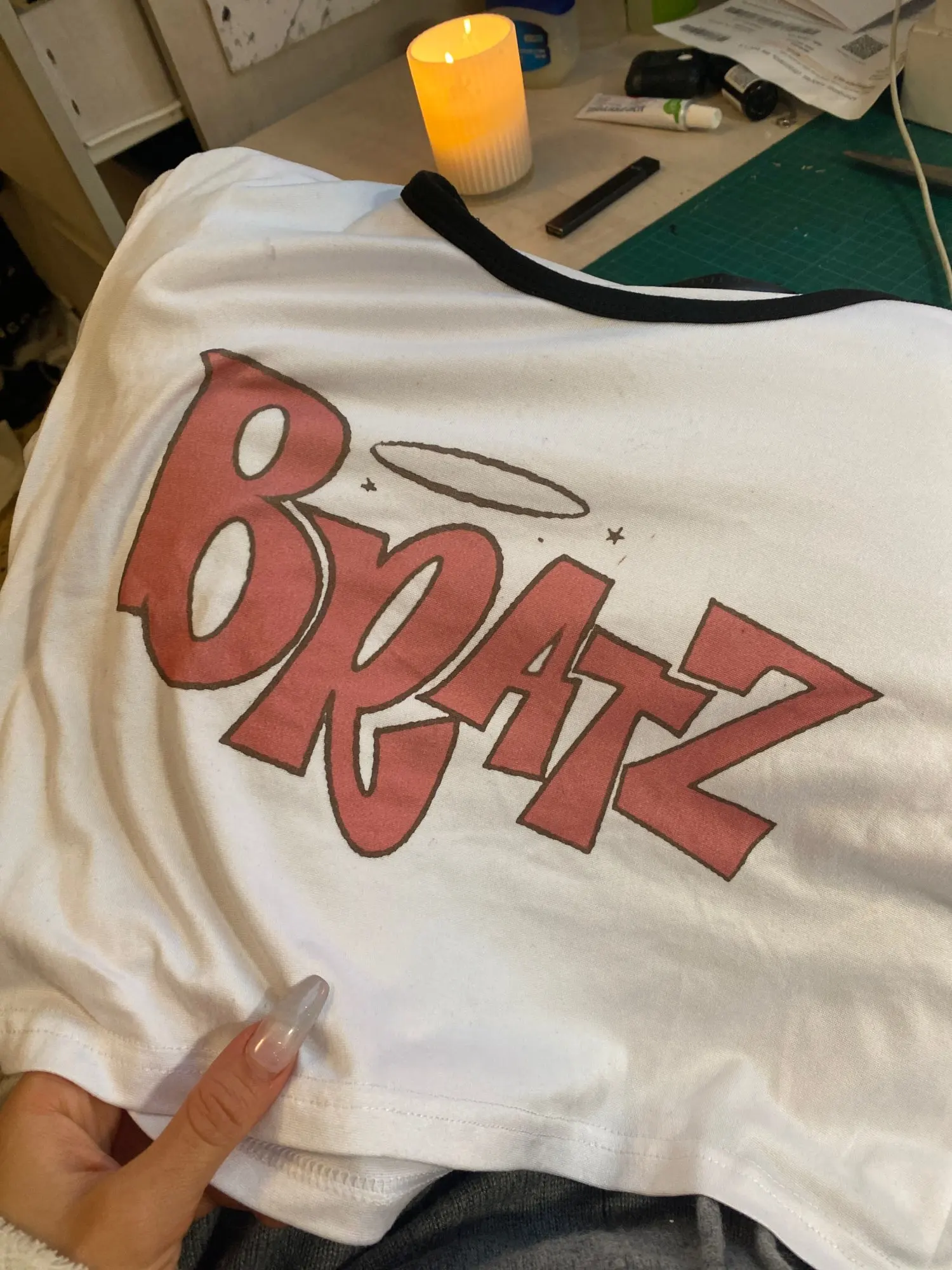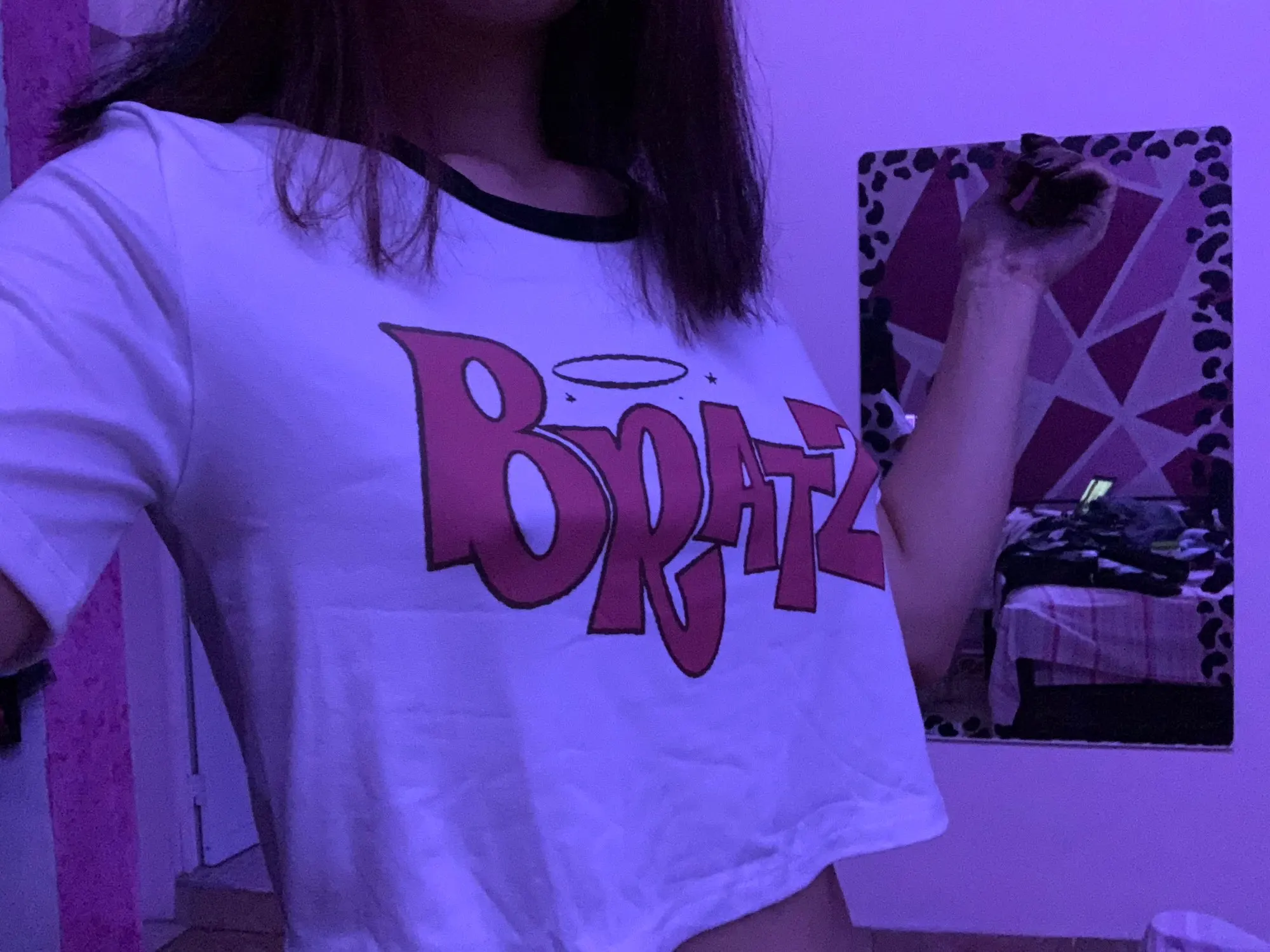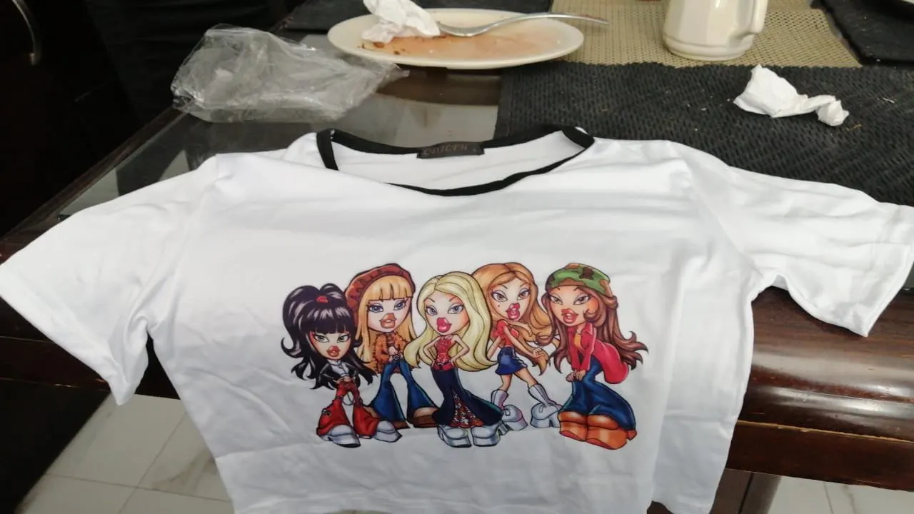 Материал рубашки очень тонкий и просвечивается. Потому что он такой тонкий, принт bratz на рубашке тоже был искажен. Пожалуйста, не покупайте, потому что это очень плохое качество. Даже не стоит 3 доллара