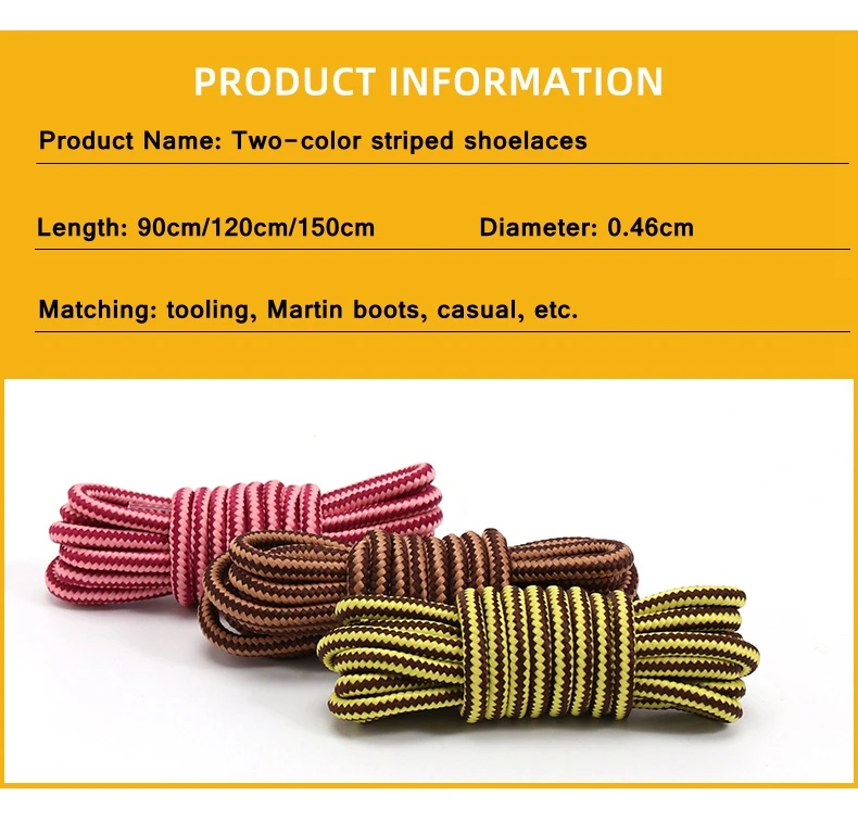 Название продукта: двухцветные полосатые шнуркиДлина: 90 см/120 см/150 смДиаметр: 0,46 смСоответствие: инструменты, Ботинки Martin, повседневные и т. Д.