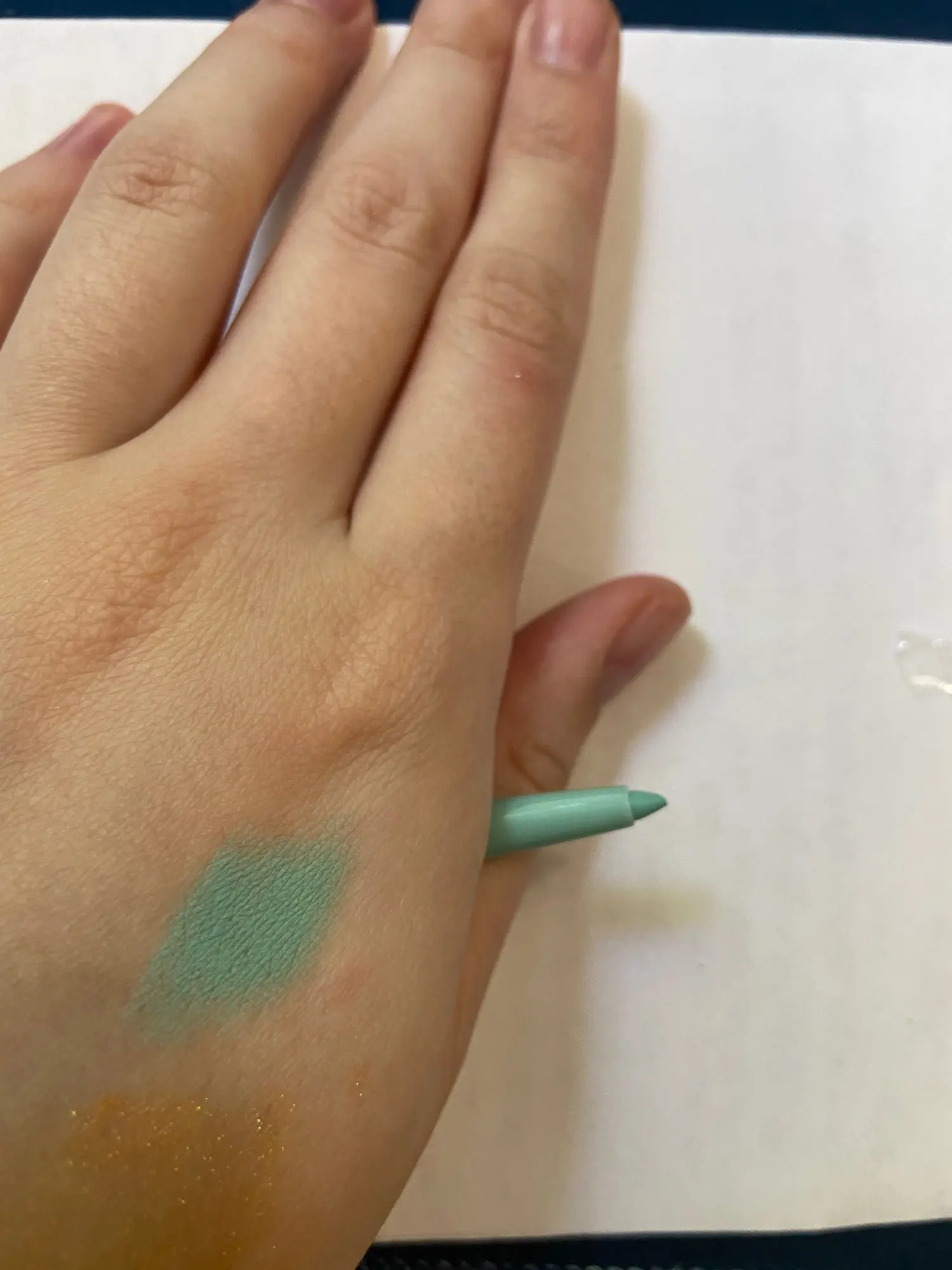Карандаш стойкий, не размазывается, но отпечатывается (не знаю как такое возможно, но факт). Цвет все таки голубой, не мятный