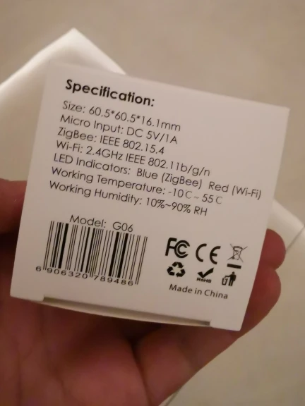 Вход питания: DC 5V1A(Micro USB, адаптер не входит в комплект)Беспроводной Тип: Wi-Fi (2,4 ГГц) + ZigBee3.0 + Bluetooth5.0 (опционально)Рабочая температура:-20 °C ~ 85 °CРабочее увлажнение: 10% ~ 90% (без конденсации)Размер продукта: 50*50*11 мм