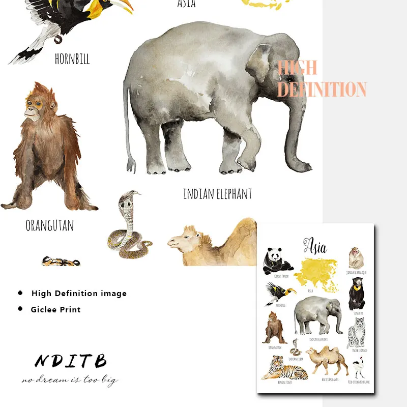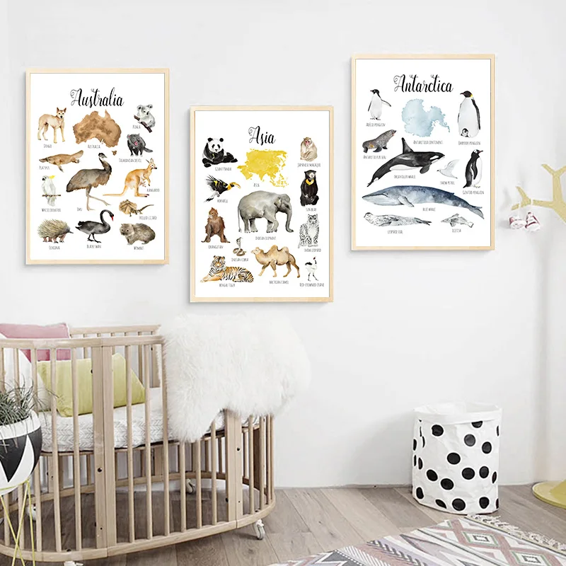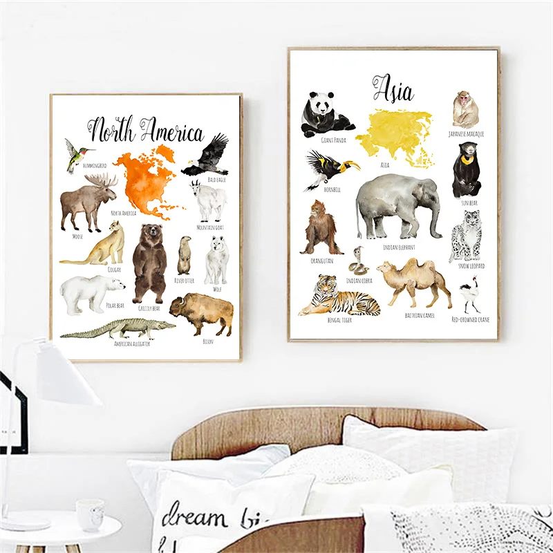 Детская развивающая Картина на холсте с изображением животных, карта, детский постер, Скандинавская Художественная печать, Настенная картина, украшение для детской комнаты