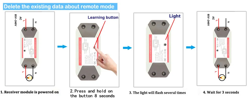 1. Нажмите и удерживайте кнопку обучения (на приемнике) 8 секунд. Существующие данные будут удалены успешно. Примечание1,Перезагрузите приемник, прежде чем вы захотите изменить режим работы одного пульта дистанционного управления.2. После сброса все пульты дистанционного управления больше не могут работать.