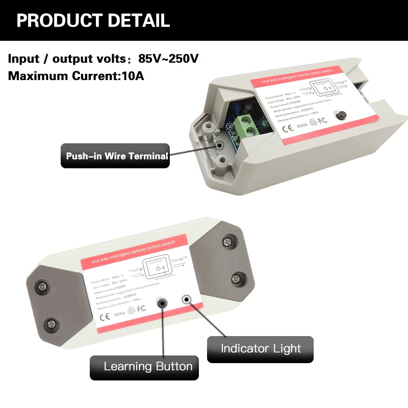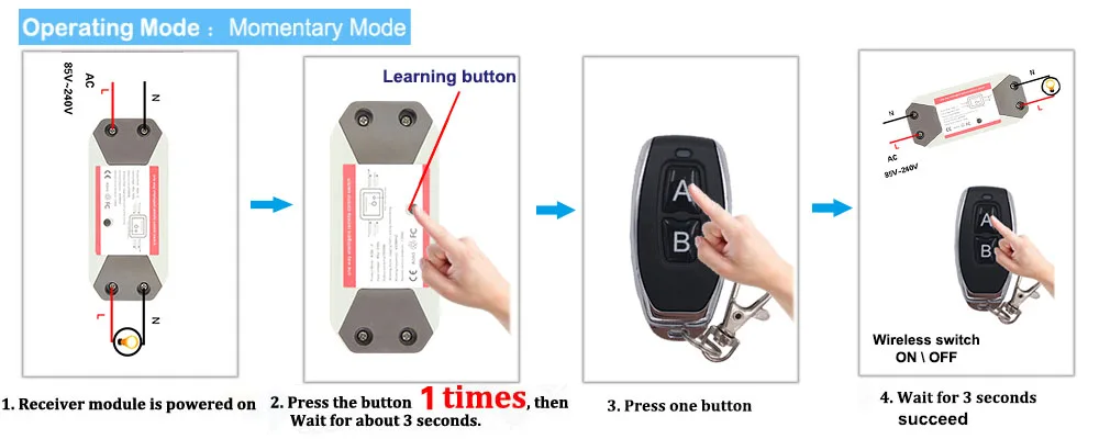 1. Нажмите кнопку обучения (на приемнике) Один раз. Подождите 3 секунды;2. Нажмите одну кнопку на пульте дистанционного управления. Подождите 3 секунды. Преуспевает.