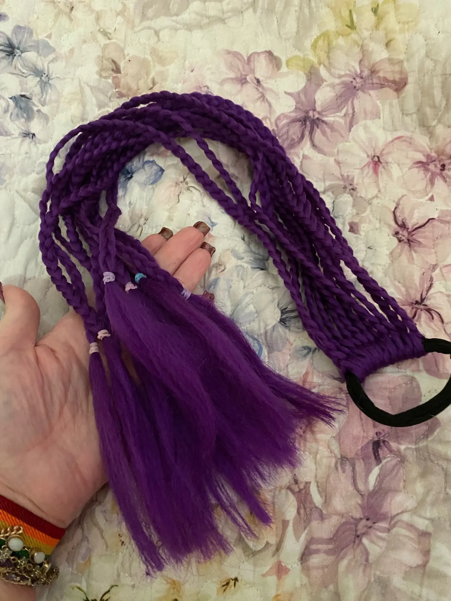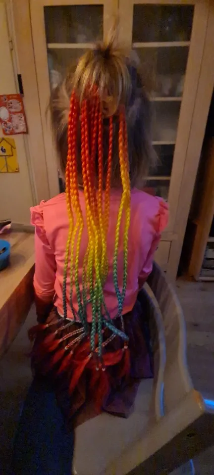 Очень яркий, дочке понравился такой хвостик с косичками, материал больше напоминает не волосы, а шерстяные нити, но все же понравился, прикольно, брала жёлтый неоновый цвет.