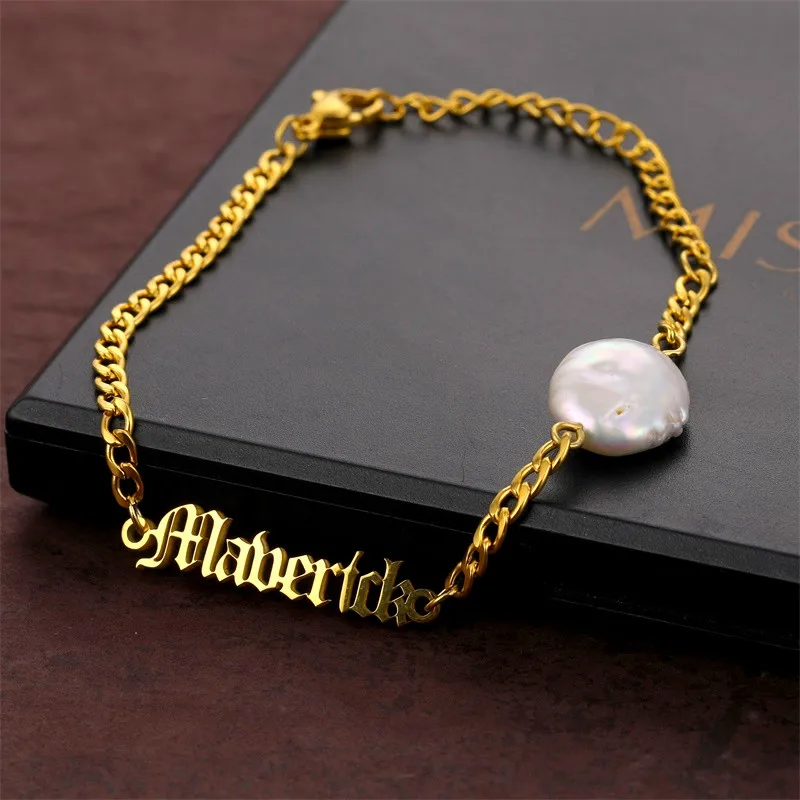 Индивидуальные персонализированные браслеты для женщин, натуральный пресноводный жемчуг, золотая цепочка из нержавеющей стали, кубинский браслет на заказ