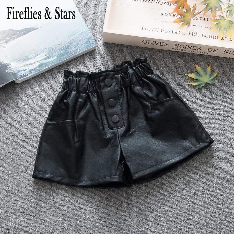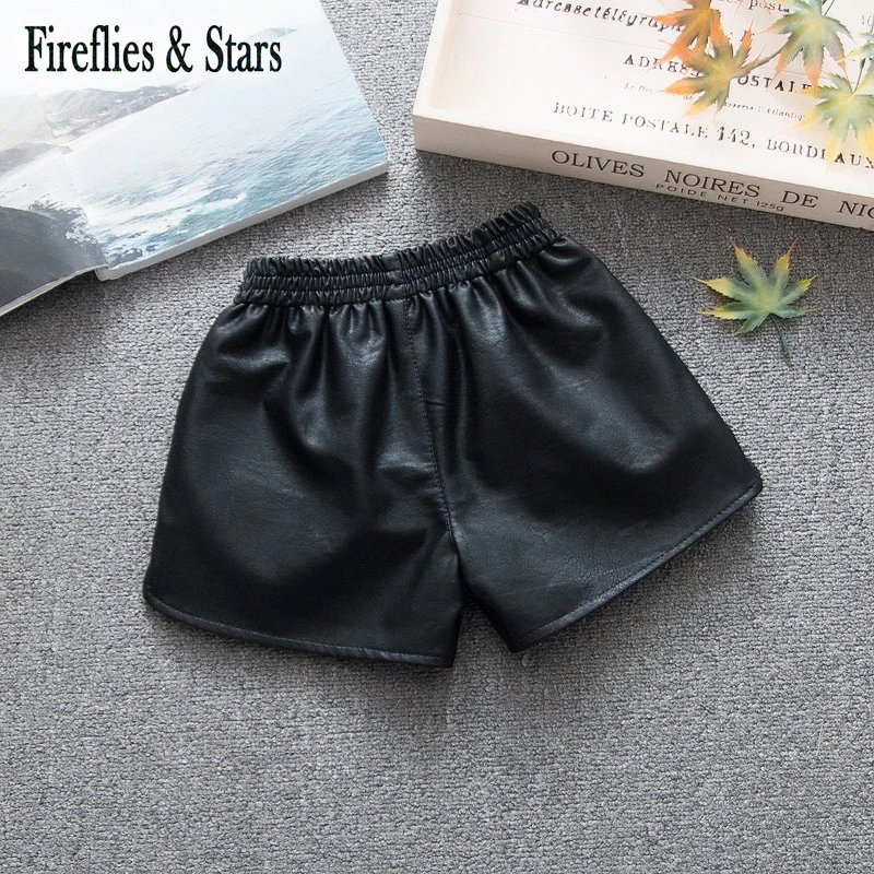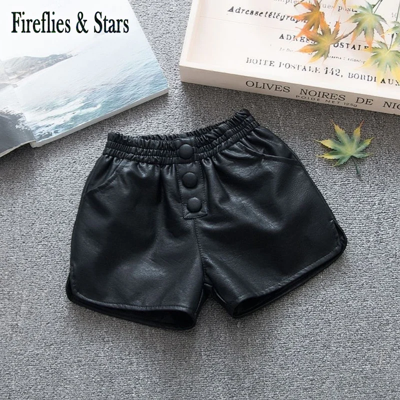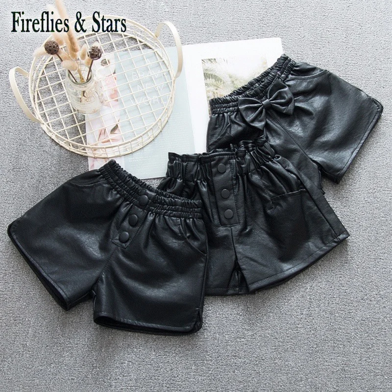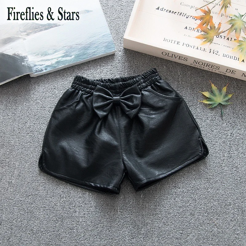 Демисезонные шорты из искусственной кожи для девочек, шорты для малышей, детские шорты, детская одежда, новинка, плиссированная талия из искусственной кожи с бантом и заплатками, для детей от 2 до 14 лет