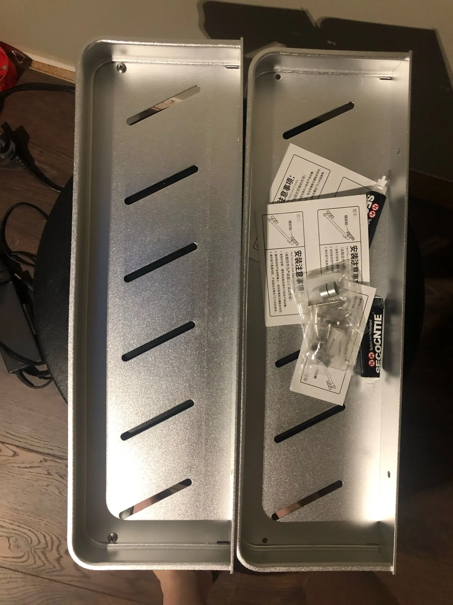За свою цену супер, но один уголок замят . В комплекте к каждой полке идет по два дюбеля шурупа и заглушки -они пластиковые. Плюс скотч для монтажа и спец клей, для чего так пока и не поняла. Шло очень долго даже с учетом быстрой доставки . Покупка 29 августа пришло 28 сентября сберлогистикой