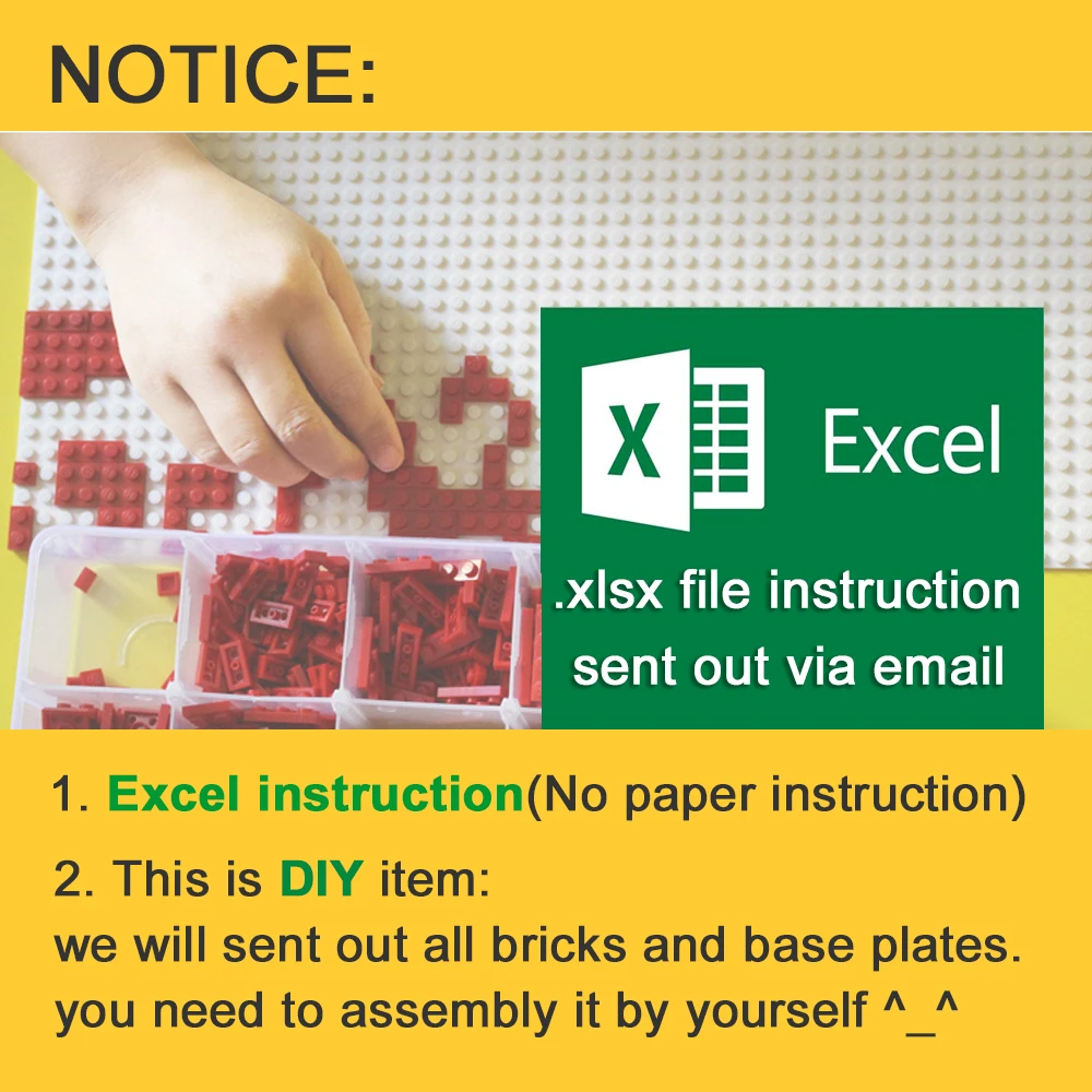 Этот набор содержит:1, 25,5 см x 25,5 см (32 шпильки x 32 шпильки) белый блок опорной плиты.2, красочные кирпичи.3, Office Excel. Инструкция xls type, отправляется вам по электронной почте.