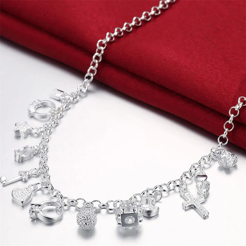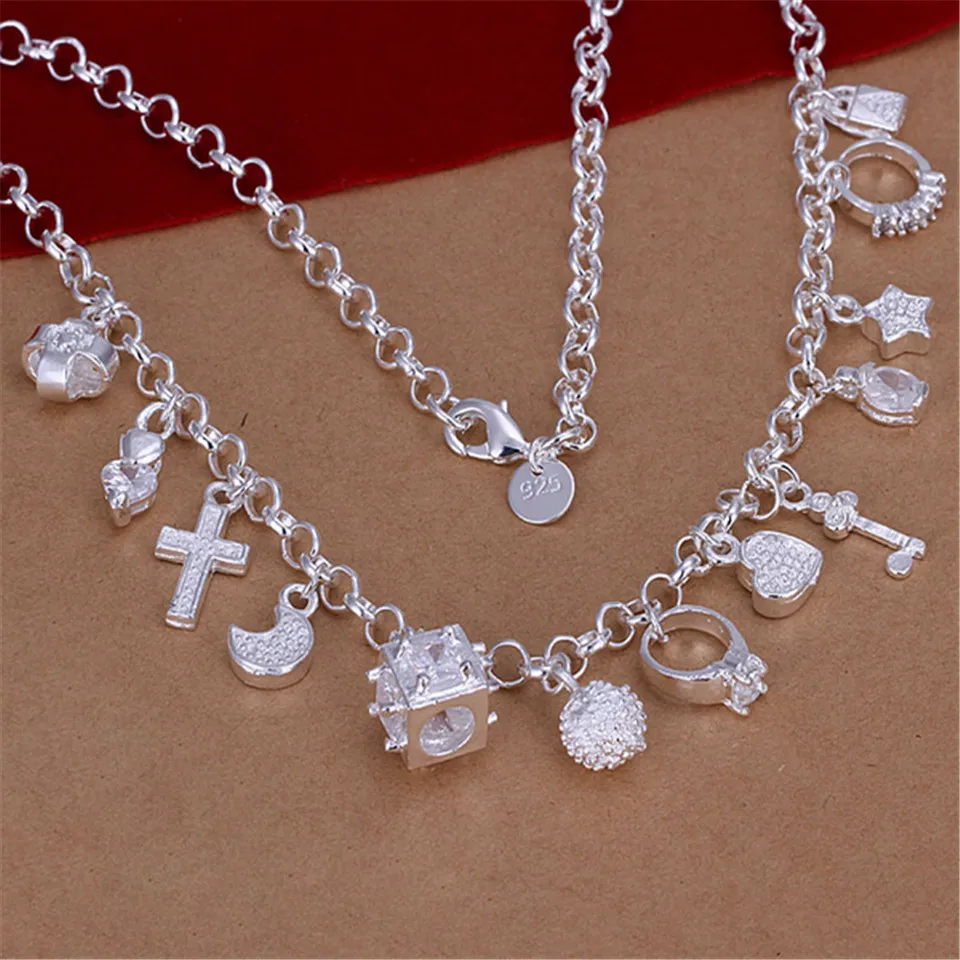 925 Серебряный набор украшений для женщин модные 13 различными подвесками браслет ожерелье, свадебные ювелирные изделия, ювелирное изделие, подарок