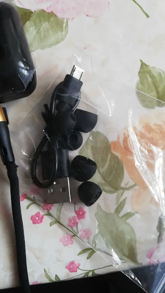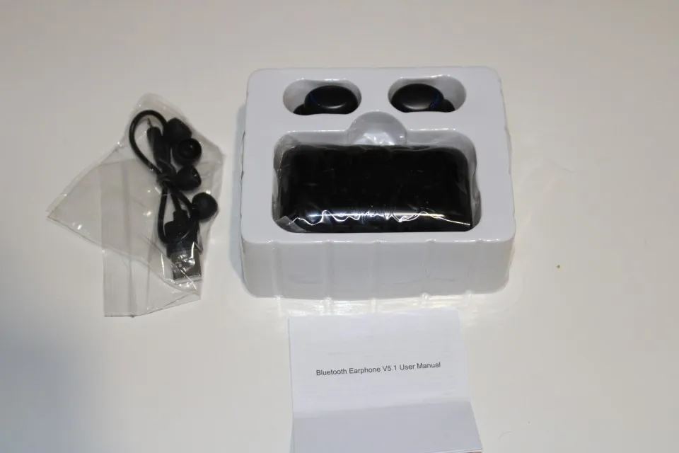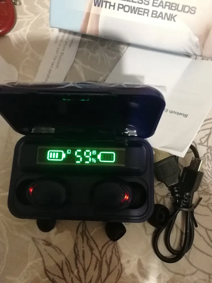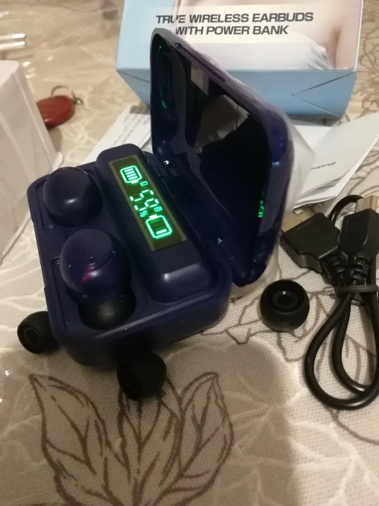 недорогой комплект , бокс , наушники 2 шт, кабель юсб ( очень короткии), 2 типа размера накладок на наушники(запасные). наушники сразу при коннектились хорошо по блютузу (к китайскому телефону). бокс показывает зарядку в % каждого наушника, заряжать можно по одному.