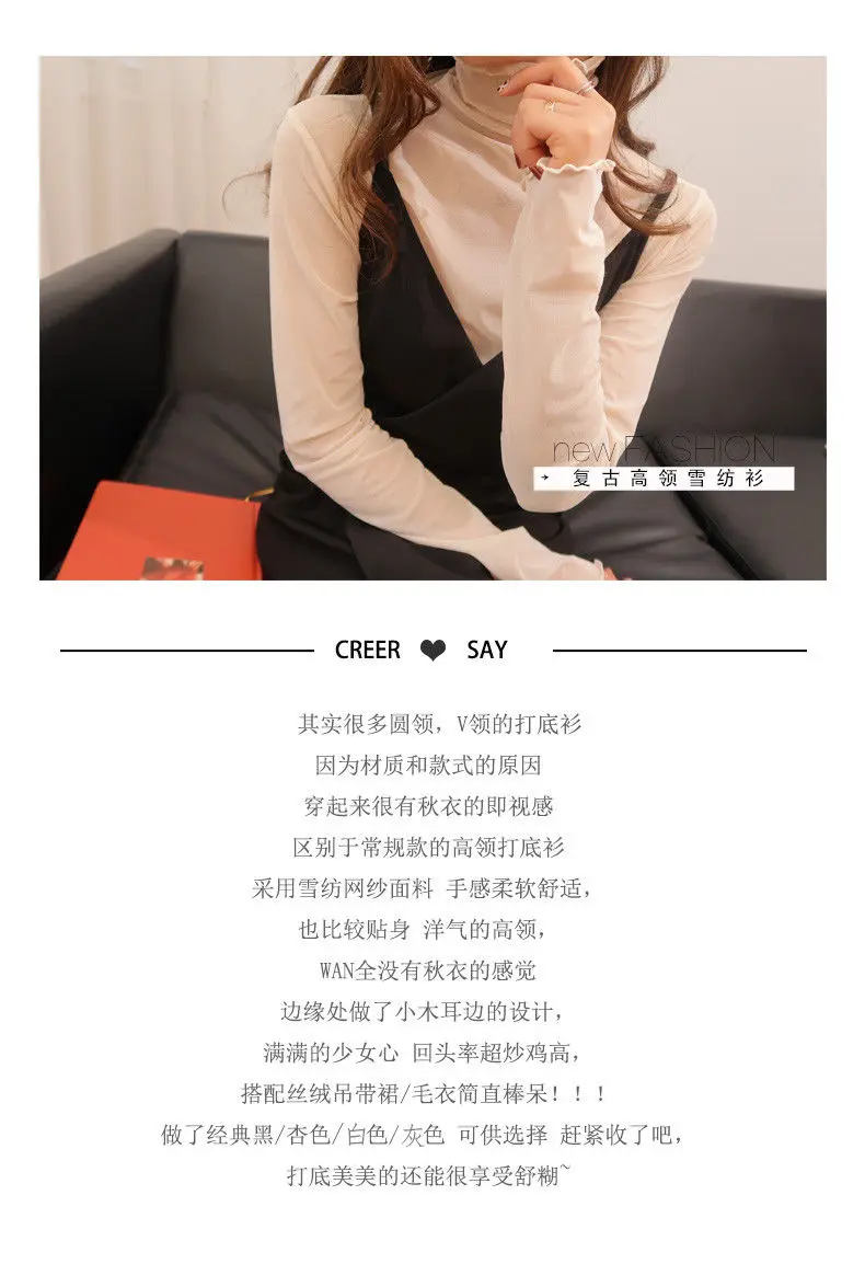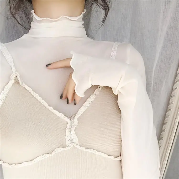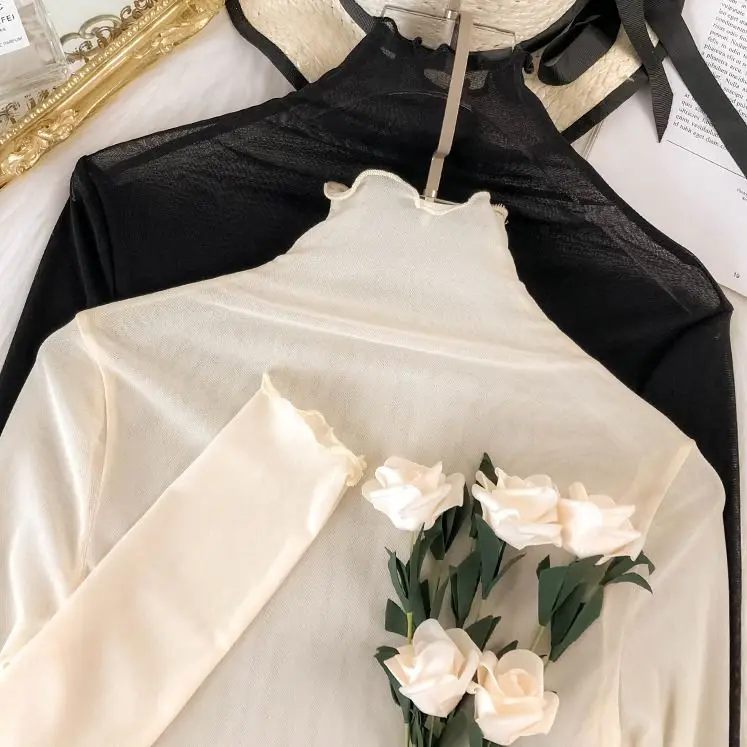 Осенняя Женская одежда, тонкая водолазка, сетчатый топ, рубашки стрейч с длинным рукавом