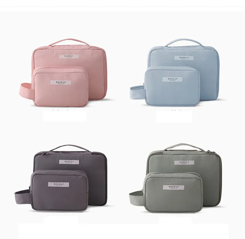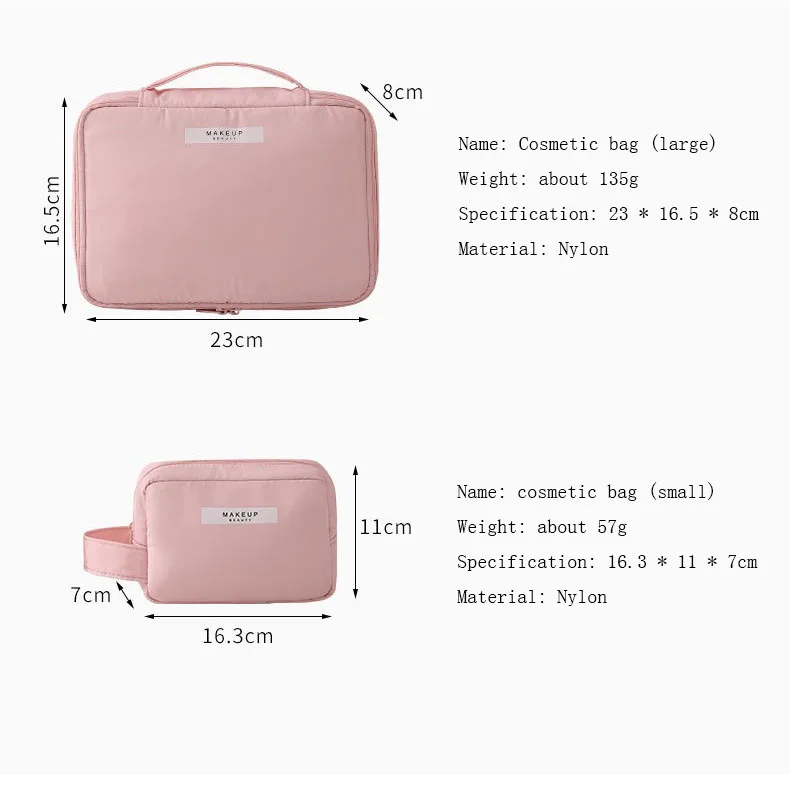 Name: Cosmetic bag (large)Weight: about 135gSpecification: 23 * 16.5 * 8cmMaterial: NylonName: cosmetic bag (small)Weight: about 57gSpecification: 16.3 * 11 * 7cmMaterial: NylonThe specification data is obtained from actual measurement. Due to different measurement methods, an error of 1-2cm may occurColor may have different effects on different monitors, and may be slightly different, I hope you understand