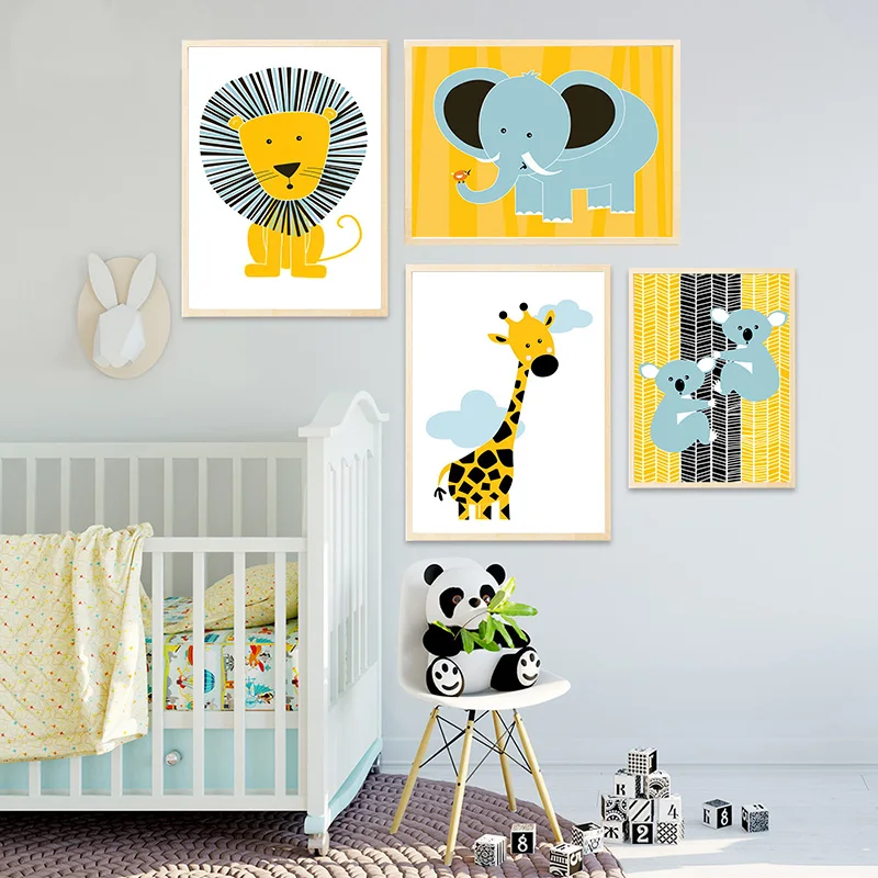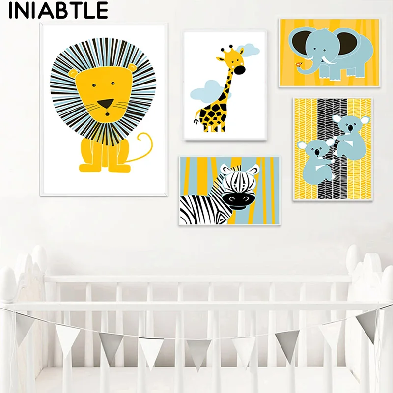 Желтый Лев слон жираф постер с зеброй детская настенная живопись детская картина животное печать холст картина скандинавский ребенок декор для детской комнаты