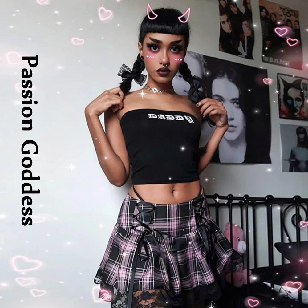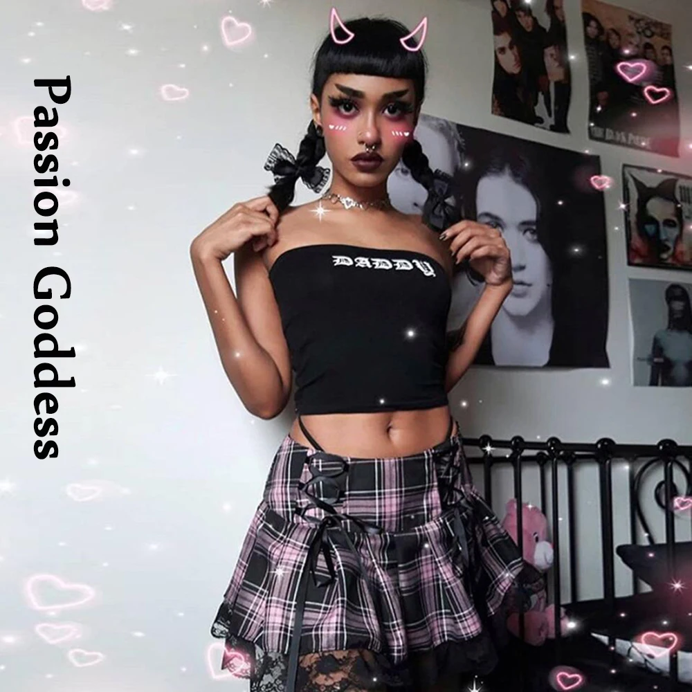 Harajuku Для женщин розового цвета в клетку юбки Высокая Талия кружевные юбки с оборкой в готическом стиле крест Разделение повязки юбка Колледж Милая плиссированная кружевная юбка