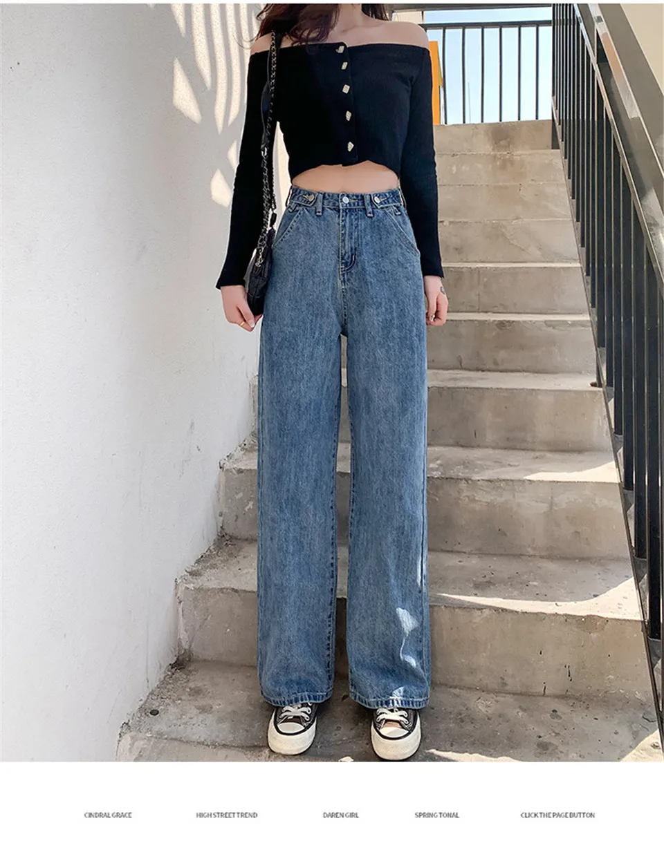 Джинсы женские прямые с завышенной талией, модные штаны из денима с широкими штанинами, уличная одежда синего цвета