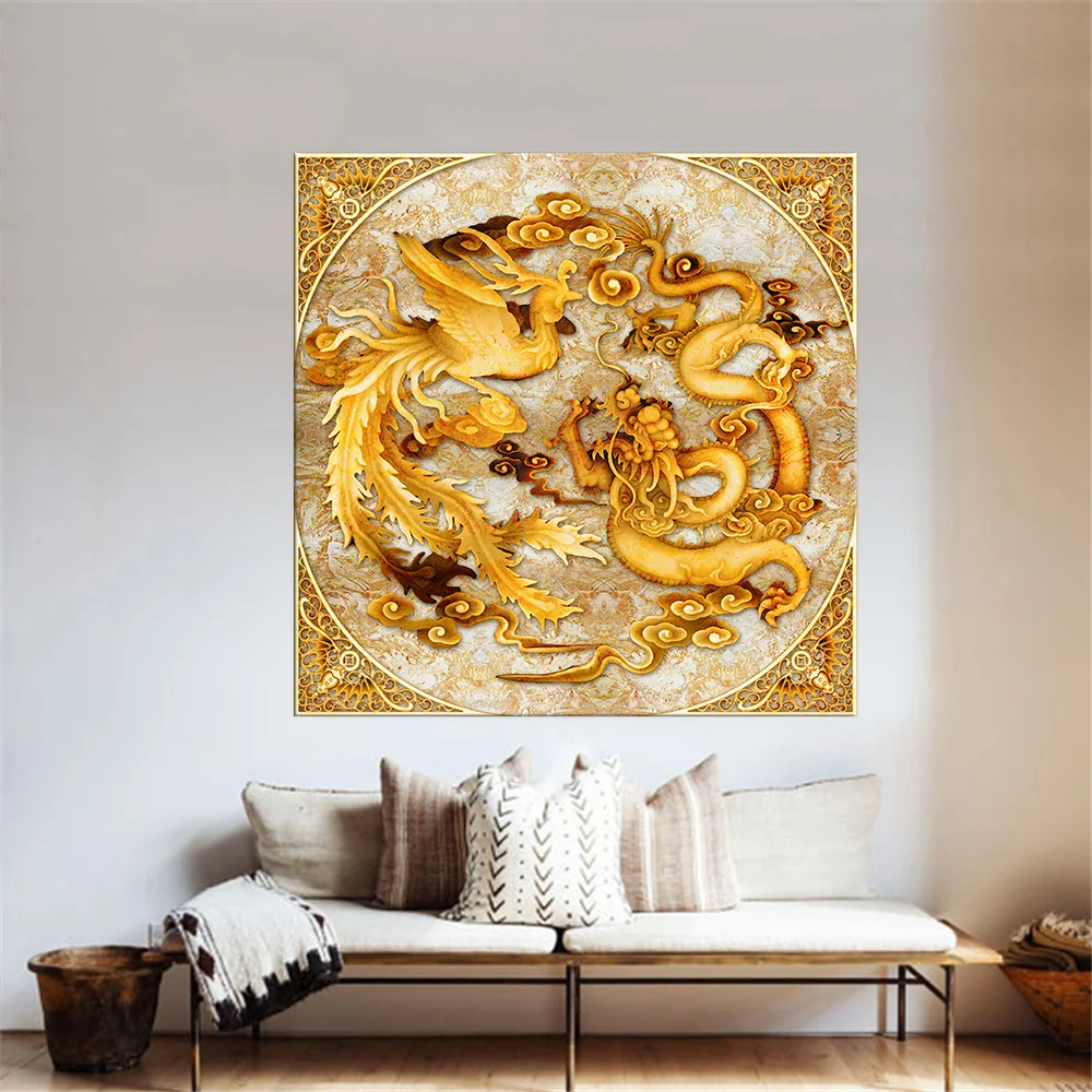 Картина маслом большого размера с изображением Золотого Дракона, настенная живопись, идеальное искусство, для гостиной, без рамки