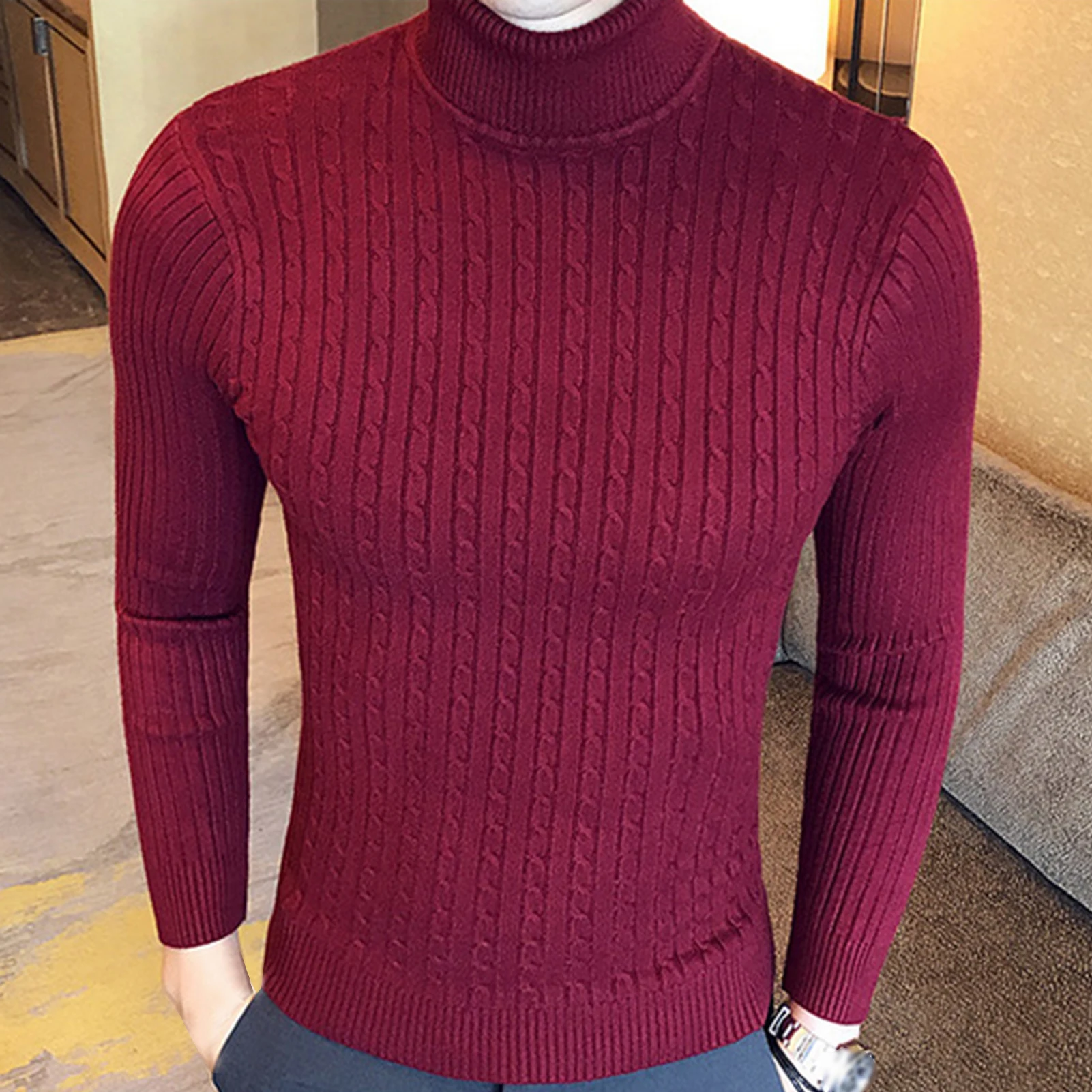 Осенне-зимний мужской свитер с высоким воротником, тонкий пуловер, вязаный пуловер с узором, черный, винно-красный пуловер, свитер, мужские свитера с высоким воротником