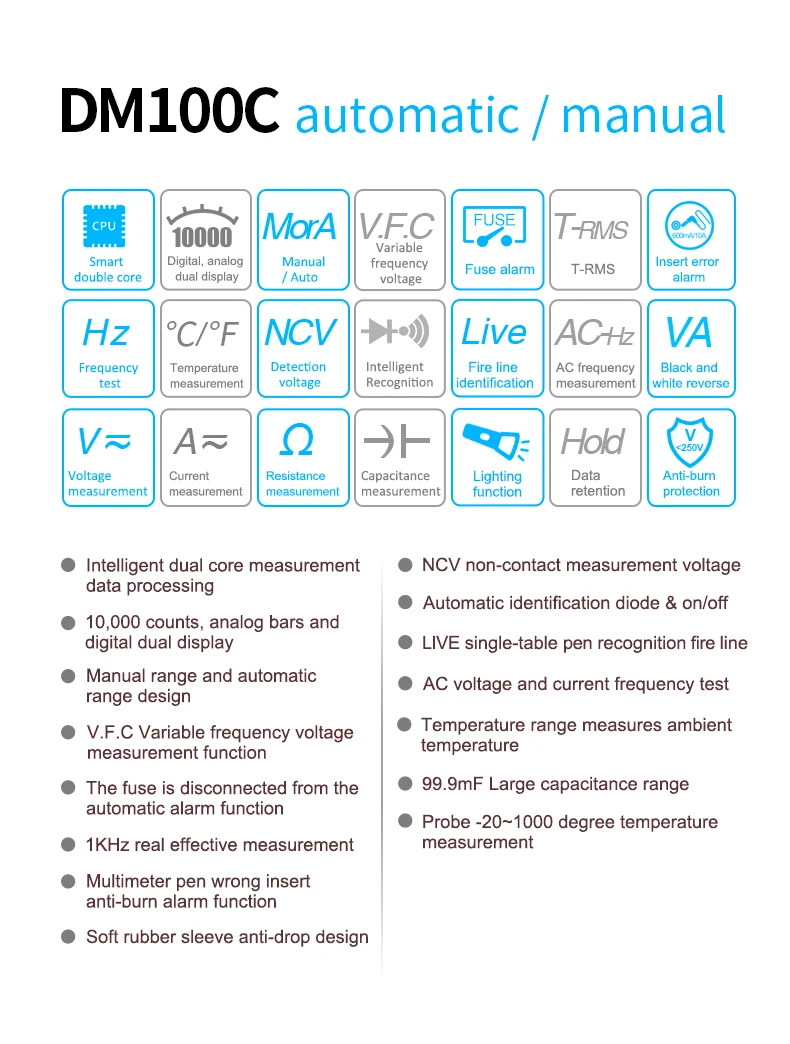 Описание Этот инструмент представляет собой 9999 счетчик, Ручной цифровой мультиметр с истинным виртуальным значением и ручной/автоматической интеграцией. Он имеет большой, двойной, инвертированный цифровой ЖК-дисплей с имитацией баров и элементы освещения, которые легко читаются пользователям. Он имеет функции сигнализации для плавкого предохранителя, неправильной вставки измерительного щупа, защиты от перегрузки и индикации низкого напряжения батареи. Это отличный многофункциональный инструмент для профессионалов, фабрик, школ, энтузиастов или семей. Особенности: 10000 отсчетов, аналоговые полосы и цифровой двойной дисплей, интеллектуальная двухъядерный измерение обработки данных. Ручной диапазон и Автоматический диапазон. V.f. C Функция измерения напряжения с переменной частотой, Бесконтактное измерительное напряжение NCV, переменное напряжение и текущий Частотный тест, автоматический идентификационный диод и ВКЛ/ВЫКЛ. Функция автоматической сигнализации предохранителя отключена, и ручка мультиметра неправильно вставляет функцию антиожога. 1 кГц реальное эффективное измерение, 99.9mF большой диапазон емкости. Жилая однонастольная ручка для распознавания пожарной линии. Зонд-20 ~ 1000 градусов измерение температуры. Корпус изготовлен из огнеупорного материала ABS и имеет жесткую текстуру. Кожаный чехол из ПВХ, устойчивый к падению и износу. Характеристики: Материал: АБС-пластик Диапазон передач: Автоматический диапазон/ручной диапазон Дисплей: Реверсивный av-экран с аналоговыми полосами и цифровым двойным дисплеем, 10000 отсчетов Рабочая среда: 600V CAT IV и 1000V CAT III Ture RMS: 1 кГц Диапазон напряжения постоянного тока: 999.9 мВ/9,999 в/99,99 в/999,9 в Разрешение напряжения постоянного тока: 0.1 мВ/1 мВ/10 мВ/100 мВ Точность напряжения постоянного тока: ± (0.5% считывания + 3 знака) Диапазон напряжения переменного тока: 999.9 мВ/9,999 в/99,99 в/750,0 в Напряжение переменного тока: 0.1 мВ/1 мВ/10 мВ/100 мВ Точность напряжения переменного тока: 999,9 мВ ~ 99,99 в: ± (0.8% считывания + 3 знака); 750,0 в: ± (1% считывания + 5 цифр) Диапазон тока постоянного тока: 99,99 μA/999.9mA/600mA/10A Разрешение тока постоянного тока: 0,01 μA/0.01mA/0.1mA/10mA Точность тока постоянного тока: 99,99μa ~ 600мА: ± (0.8% считывания + 3 знака); 10A: ± (1.2% считывания + 3 знака) Диапазон переменного тока: 99.99mA/600mA/10A Переменный ток Разрешение: 0. 01ма/0. 1мА/10мА Точность переменного тока: 99,99ма ~ 600мА: ± (1% считывание + 3 знака); 10A: ± (1.5% считывание + 3 знака) Частотный диапазон: 9,999 Гц/99,99 Гц/999,9 Гц/9,999 кГц/99,99 кГц/999,9 кГц/9,999 МГц Разрешение частоты: 0,001 Гц/0,01 Гц/0,1 Гц/0,001 кГц/0,01 кГц/0,1 кГц/0,001 МГц Точность частоты: ± (1% считывание + 3 знака) Диапазон сопротивления: 999,9Ω/9,999k Ω/99,99k Ω/999,9k Ω/9,999m Ω/99,99mΩ Разрешение сопротивления: 0.1Ω/1Ω/10Ω/100Ω/1k Ω/10kΩ Точность сопротивления: 999,9 Ω ~ 9,999mΩ: ± (0.8% считывание + 3 знака); 99,99mΩ: ± (1.2% считывание + 5 цифр) Диапазон ёмкости: 9.999nF/99.99nF/999.9nF/9,999 мкФ/99,99 мкФ/999,9 мкФ/9.999mF/99.99mF Разрешение емкости: 0.001nF/0.01nF/0.1nF/1nF/10nF/100nF/1 мкФ/10 мкФ Точность емкости: 9.999nF ~ 9.999mF: ± (4% считывание + 3 цифры); 99,99mf: ± (5% считывание + 3 цифры) Диод диапазон: 0,15 ~ 3V Разрешение диода: 0,001 в Диапазон зуммера и непрерывности: 100 Ом Зуммер и разрешение непрерывности: 1Ω Диапазон температур: -20 ~ 1000 °C / -4 ~ 1832 °F Разрешение температуры: 1 °C / 1 °F Точность температуры: ± (1% показания + 3 цифры) Пониженного напряжения подсказка: менее чем 2,4 V Рабочая температура/Влажность: 0 ~ 40 °C; <80% RH Температура хранения/Влажность: -10 ~ 