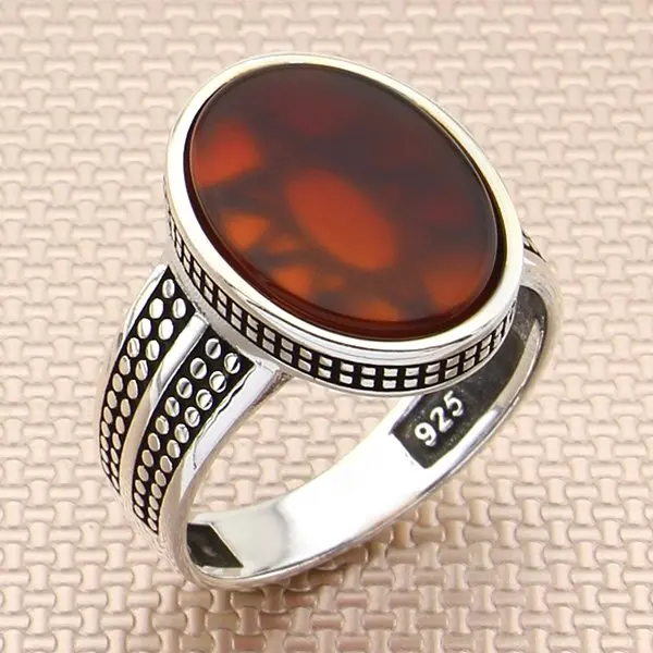Окисленные прямые овальные красные Агатовые камни, мужское серебряное кольцо, маленькая фотография, Сделано в Турции, твердое искусственное серебро