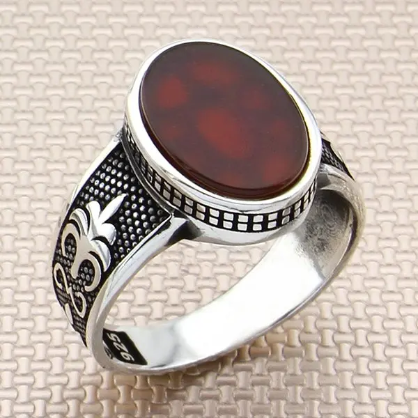 Окисленные прямые овальные красные Агатовые камни, мужское серебряное кольцо, маленькая фотография, Сделано в Турции, твердое искусственное серебро