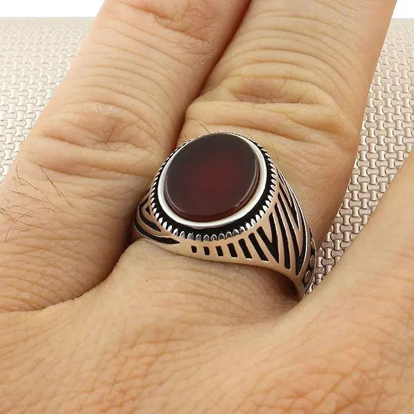 Окисленное прямое круглое мужское серебряное кольцо из красного агата с симметричным мотивом, Сделано в Турции, однотонное искусственное серебро