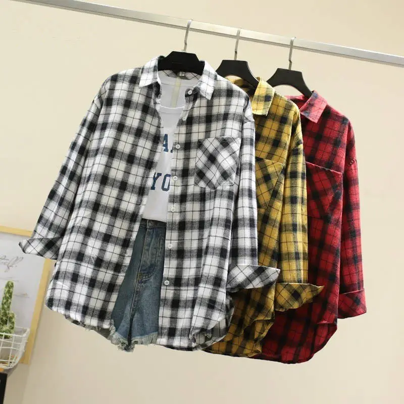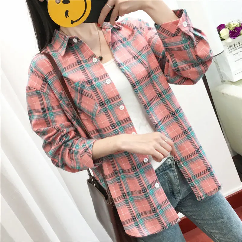 Женская клетчатая рубашка с длинным рукавом, Свободный Топ, винтажная рубашка, блузы, женская одежда