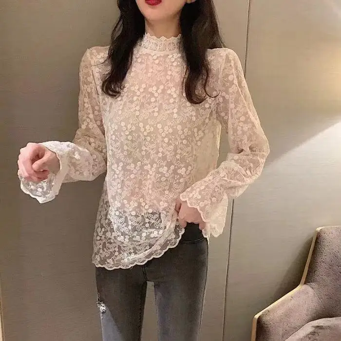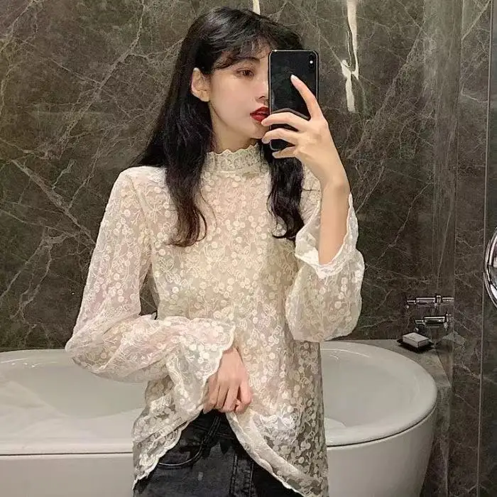 Женская блузка, Женская кружевная рубашка, сетчатый кружевной топ с воротником, 2020
