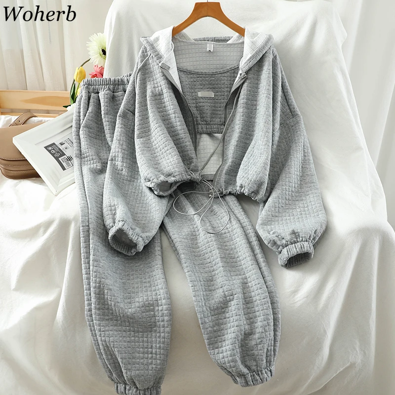 Комплект из 3 предметов Woherb, повседневный однотонный свитшот на молнии с капюшоном и кулиской, майка и шаровары с эластичной талией, модный костюм 2021