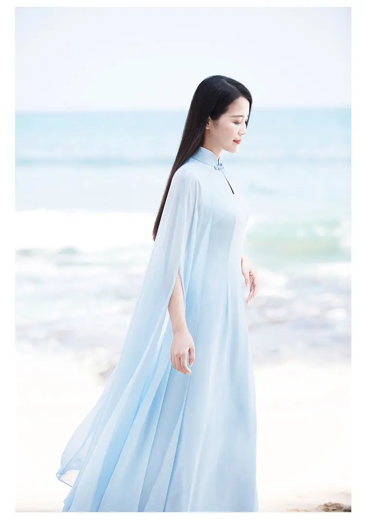 Шифоновое длинное платье Чонсам в винтажном китайском ретро стиле, белое светло-голубое платье с накидным рукавом, современное летнее платье
