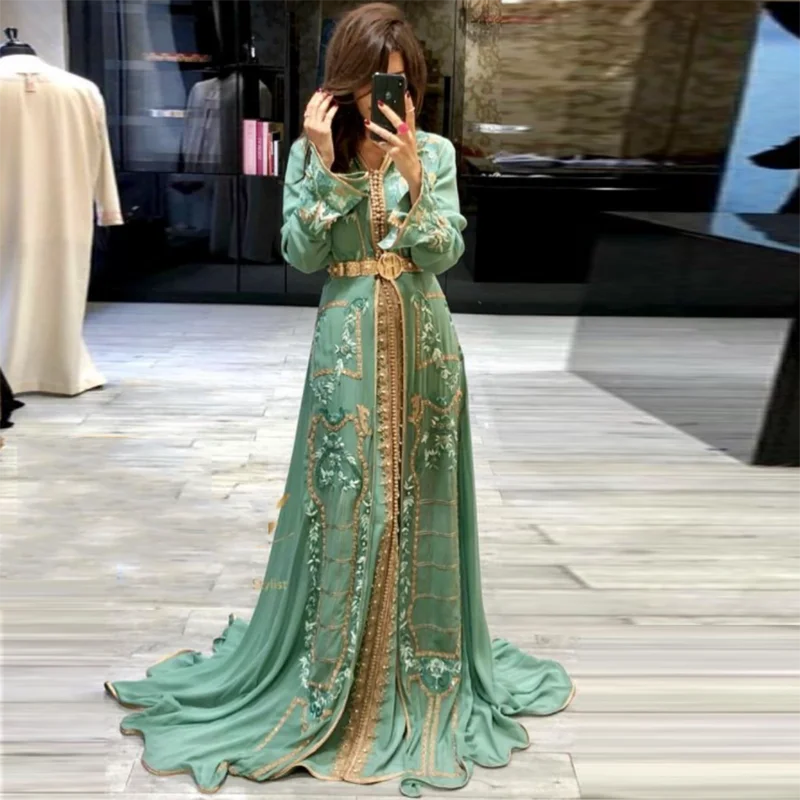 Длинное платье с аппликацией из бисера, изумрудно-зеленого цвета, марокканский кафтан, Дубай, мусульманские платья для выпускного вечера на заказ