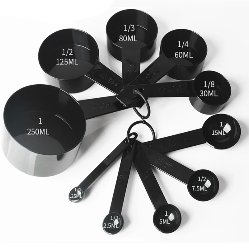 Название продукта: мерные ложки наборы чашек Материал изделия: пластик Цвет изделия: черный Размер продукта: емкость чашки: 1/8 (29,56 мл), 1/4 чашки (59,15 мл), 1/3 чашки (78,86 мл), 1/2 чашки (118,30 мл), 1 чашка (236,59 мл) Емкость ложки: 1/4sp (1,23 мл), 1/2sp (2,47 мл), 1tsp (4,93 мл), 1/2tbsp (7,40 мл), 1tbsp (14,79 мл) Посылка товара: OPP Bag