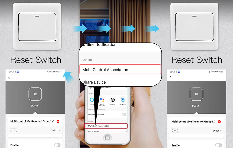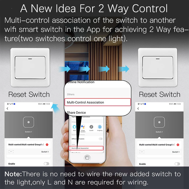 Соединение с несколькими элементами управления переключается на другой умный переключатель Wi-Fi в приложении для включения 2-сторонней функции (управление двумя переключателями на светильник)