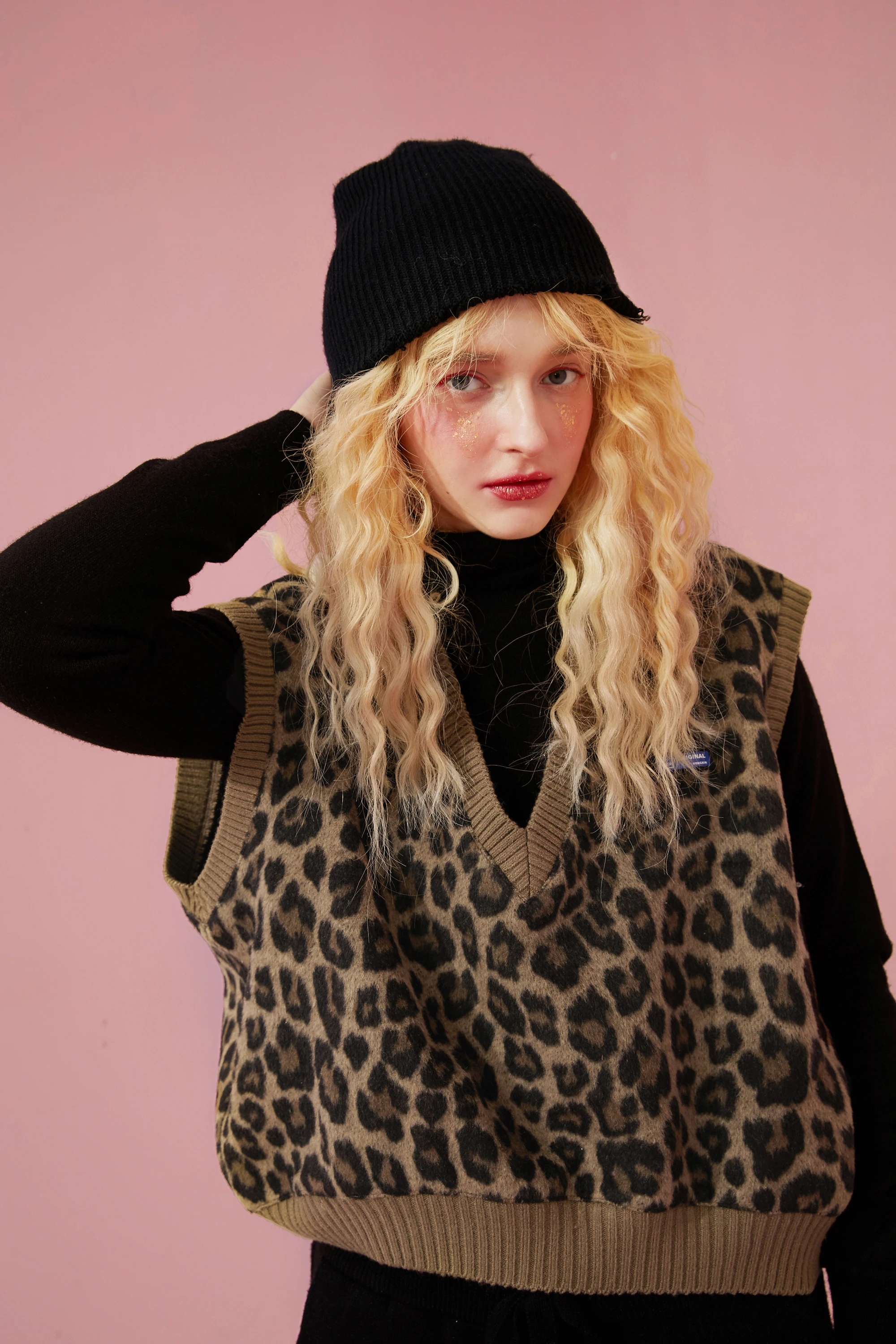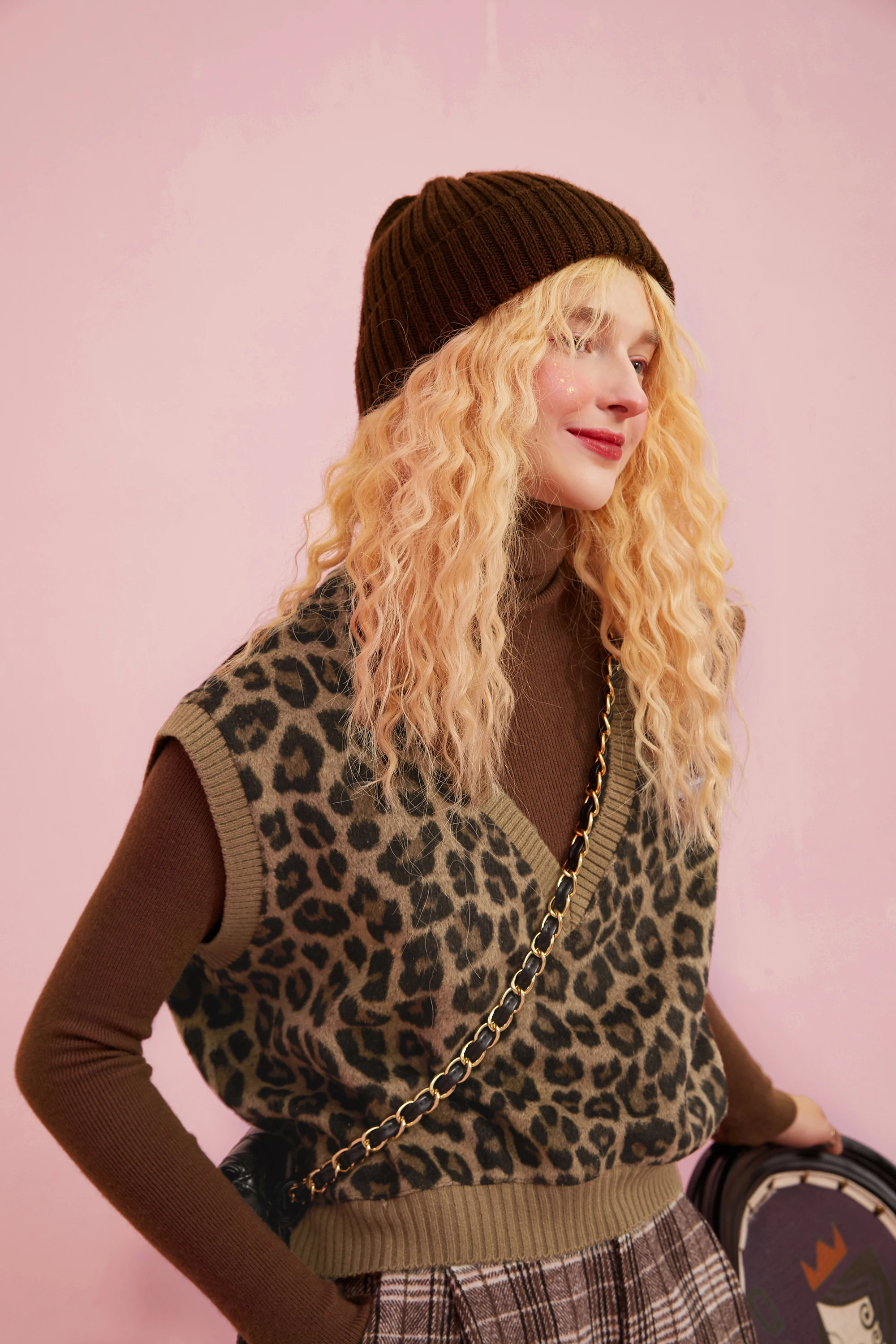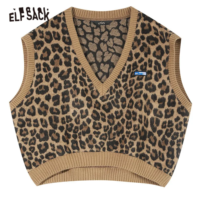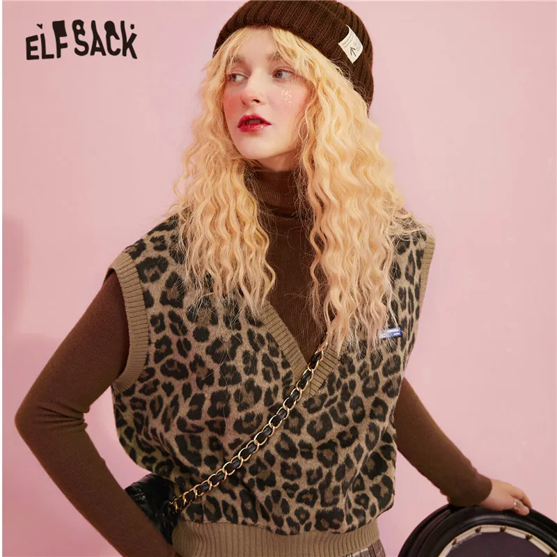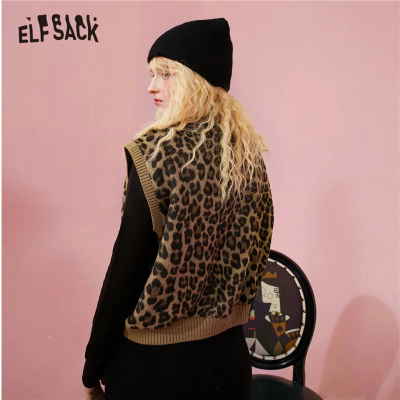 Вязаный жаккардовый пуловер ELFSACK с леопардовым принтом, Женский Повседневный свитер, жилет, корейский Повседневный винтажный Топ без рукавов с V-образным вырезом, зима 2020